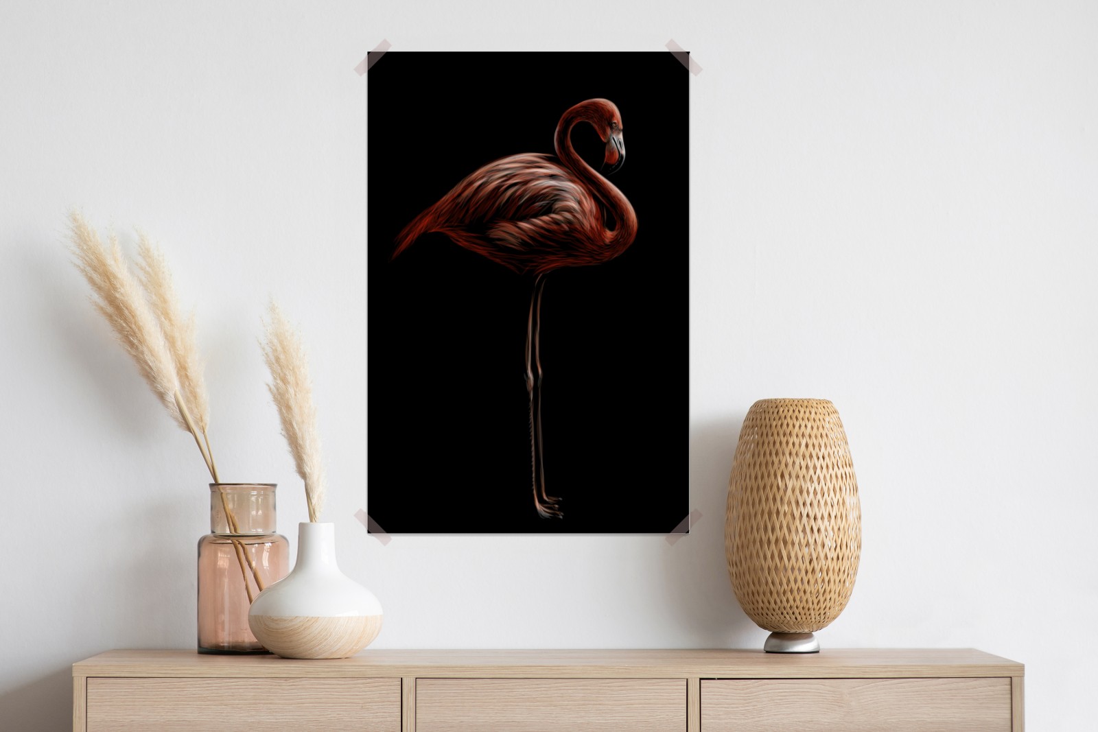 Dodaj egzotycznej elegancji do wnętrza dzięki tej wyrazistej ilustracji czerwonego flaminga na głębokim czarnym tle.