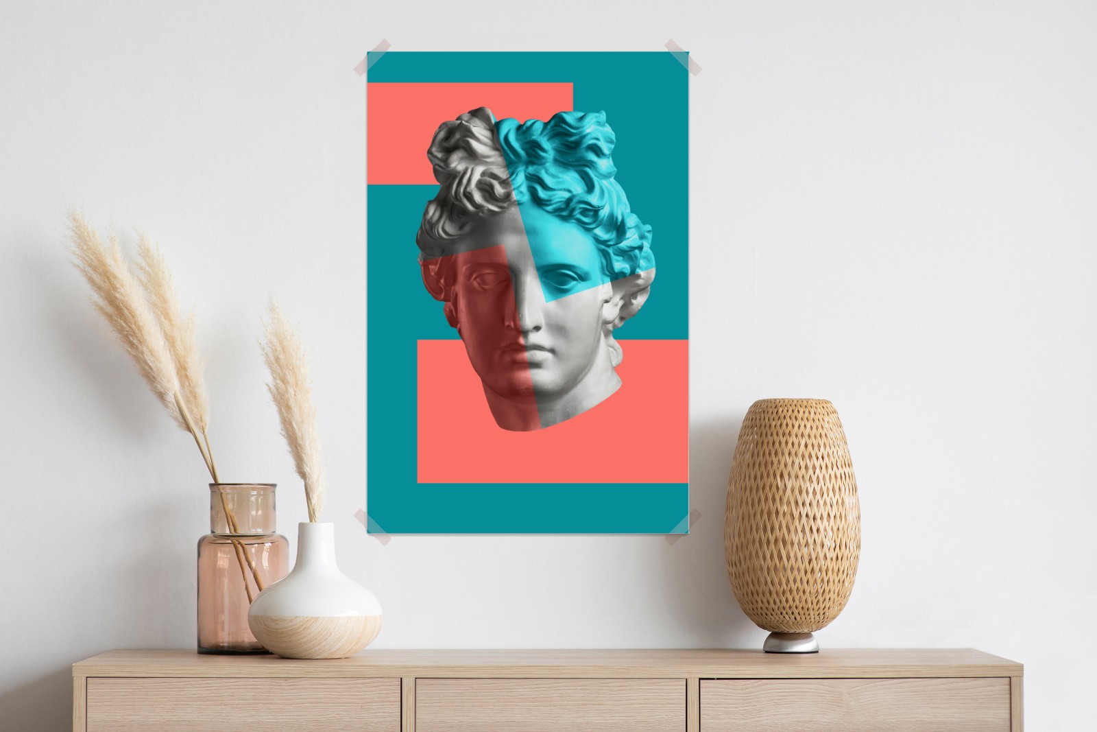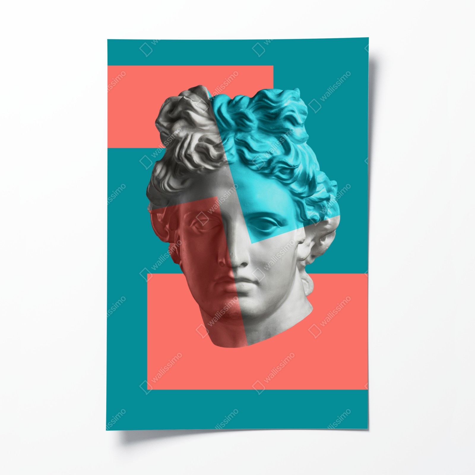 Dodaj odważny, nowoczesny akcent do wnętrza dzięki temu duotonalnemu kolażowi głowy klasycznej w turkusowych i koralowych barwach.