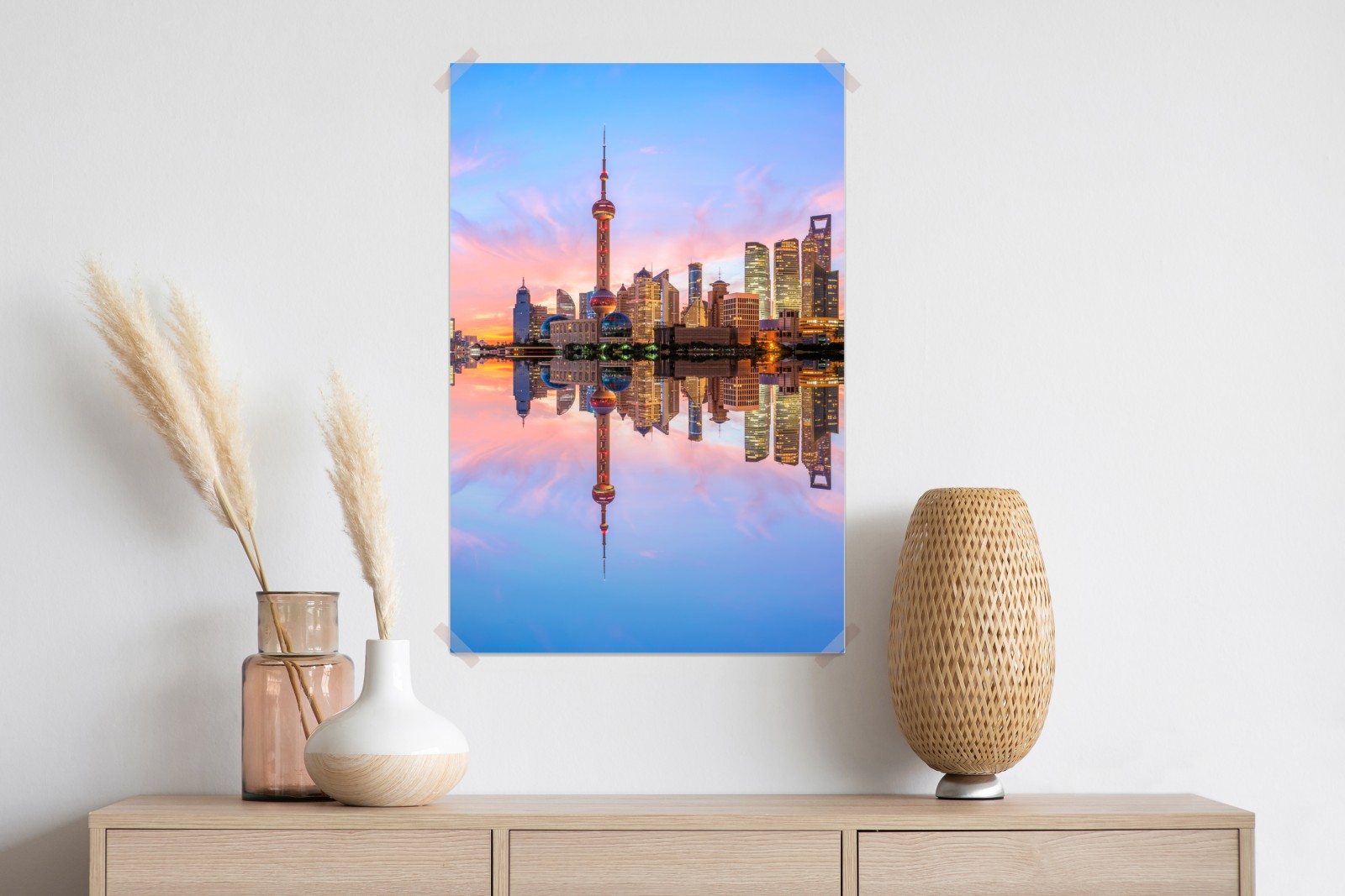 Dodaj do wnętrza świeżą energię Szanghaju dzięki pastelowemu krajobrazowi miejskiego poranka z lustrzanym odbiciem na wodzie.
