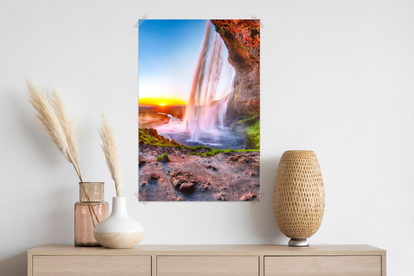 Wprowadź dramatyczne piękno wodospadu Seljalandsfoss o zachodzie słońca do swojego wnętrza dzięki żywym kolorom i uspokajającemu ruchowi.