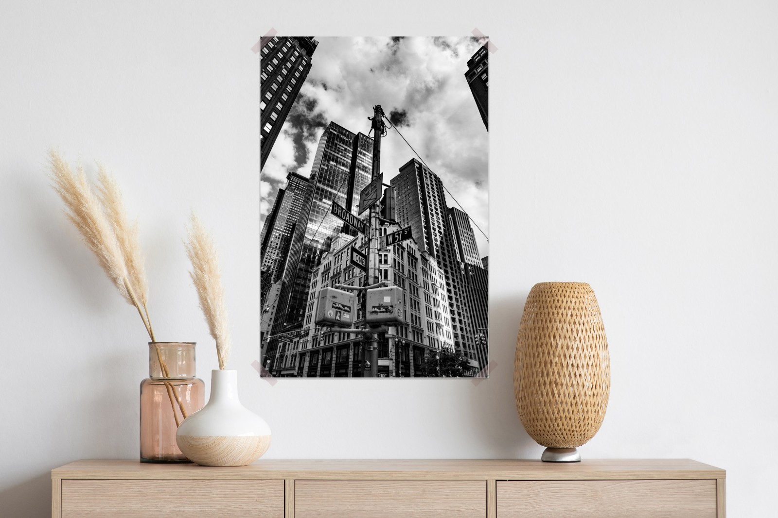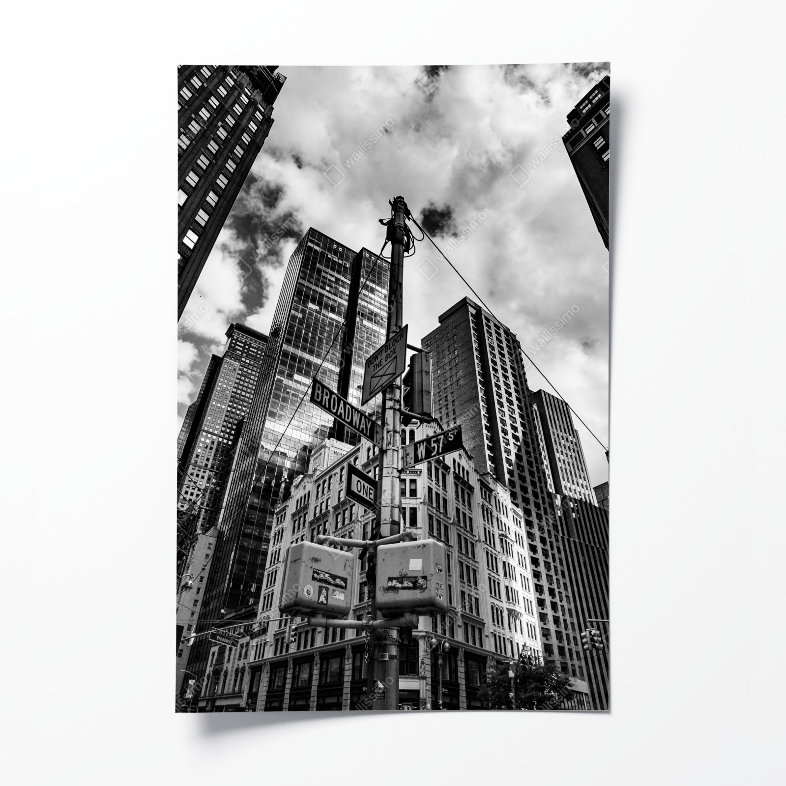 Dodaj surowej, miejskiej elegancji do wnętrza dzięki tej czarno-białej fotografii Broadway i W 57 St, z monumentalnymi wieżowcami i dramatycznym niebem.