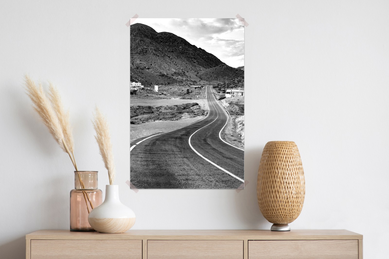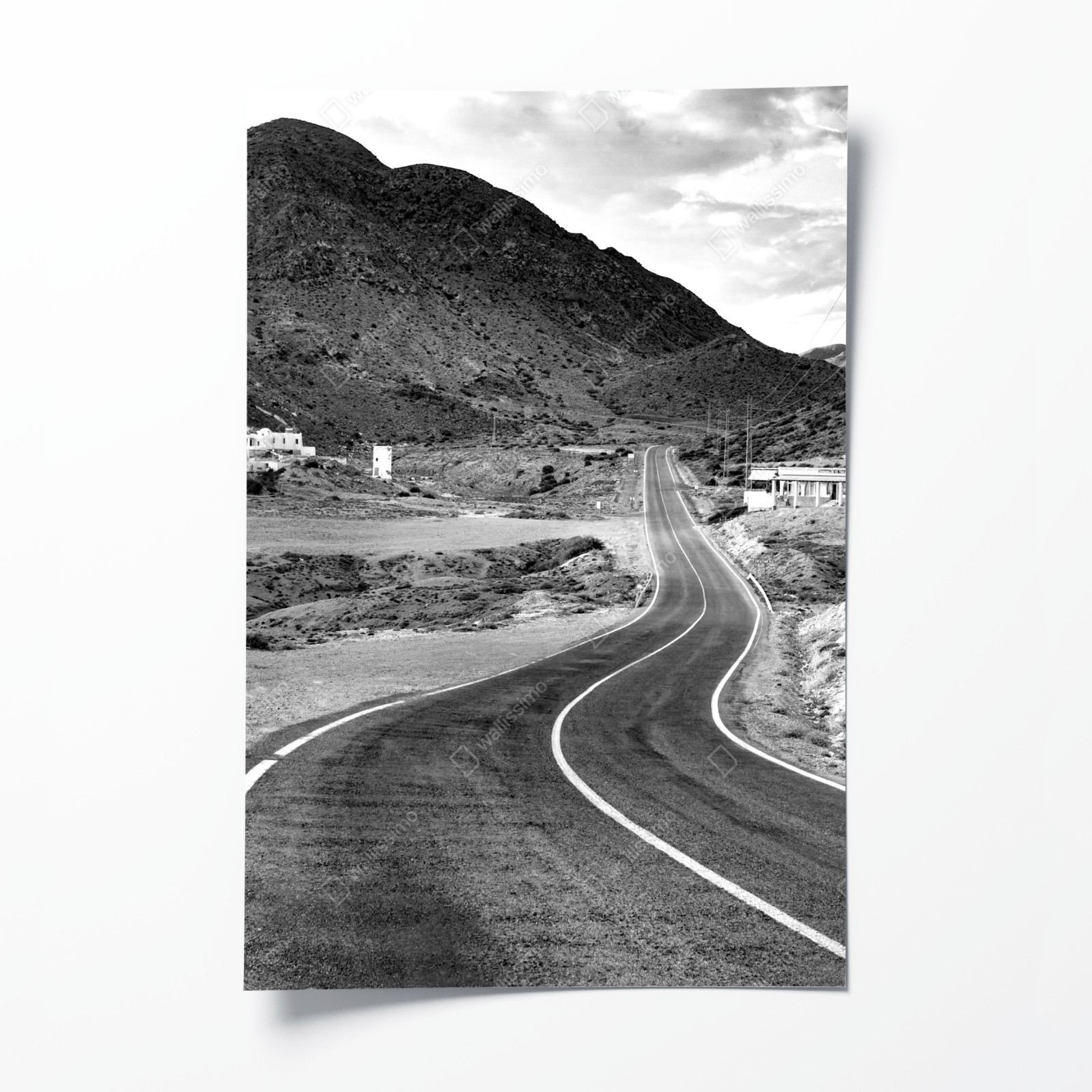 Wprowadź do wnętrza spokojny czarno-biały krajobraz z tą urokliwą fotografią krętej drogi, idealną do minimalistycznych aranżacji i dla miłośników podróży.