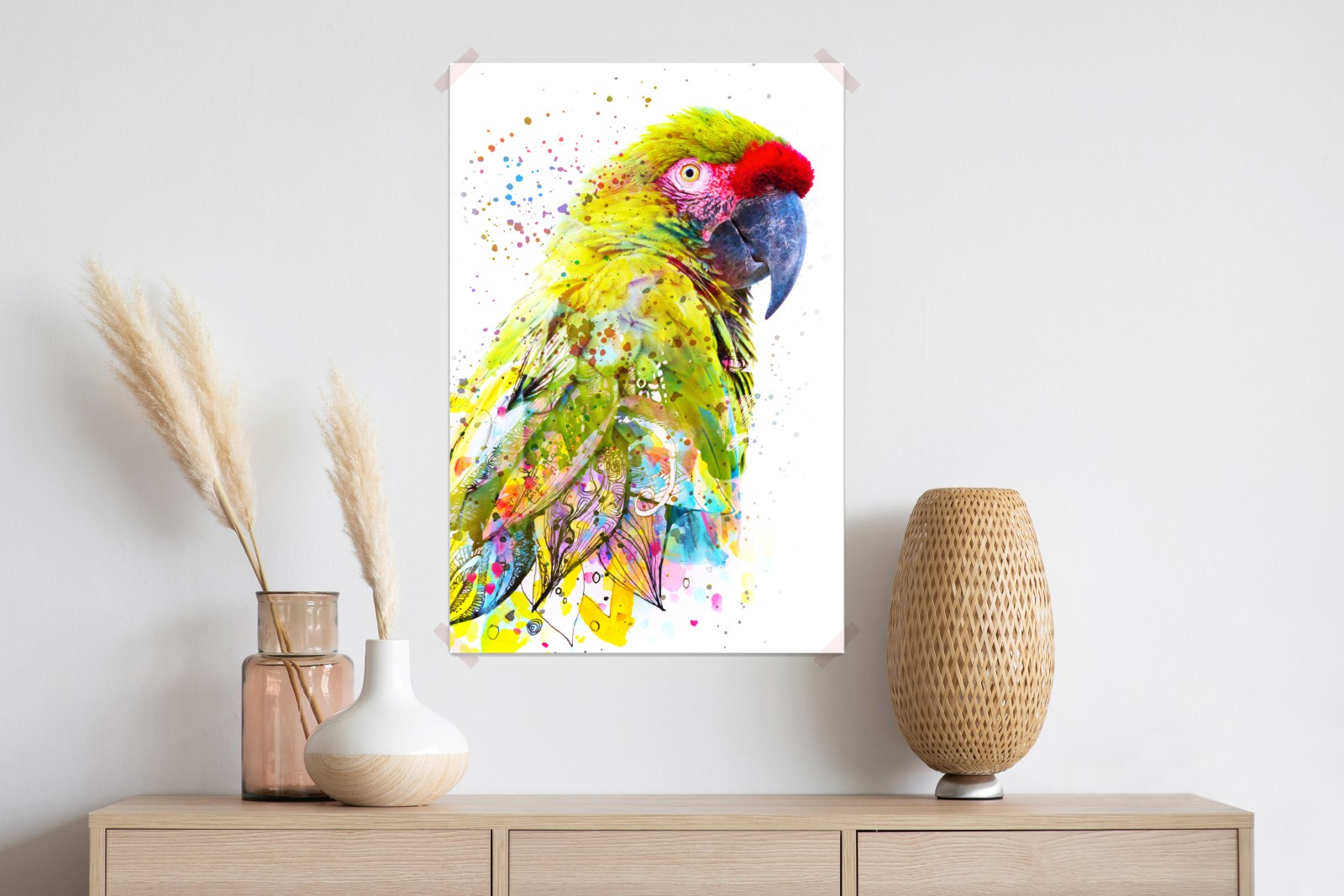 Dodaj tropikalnego koloru do wnętrza dzięki żywemu portretowi papugi w akwareli łączącemu plamy farby z detalami.
