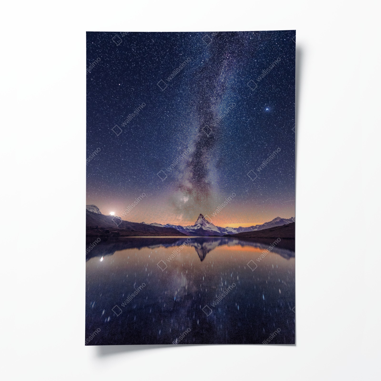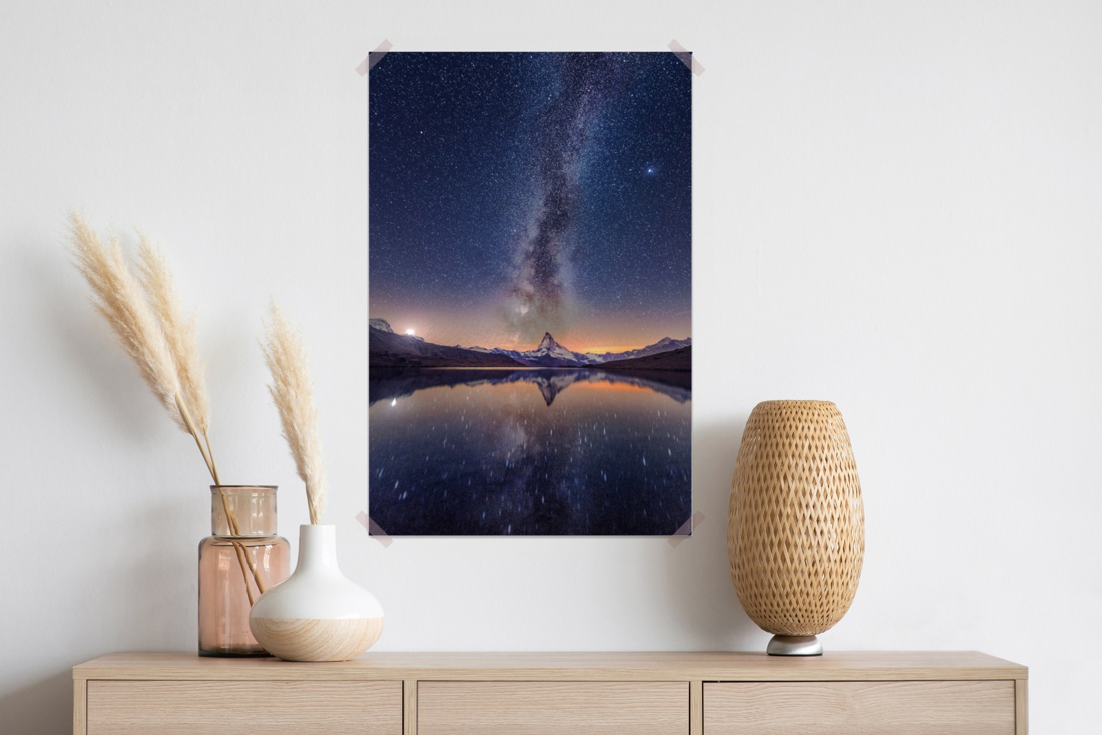 Plakat Droga mleczna nad alpejskim szczytem odbita w jeziorze