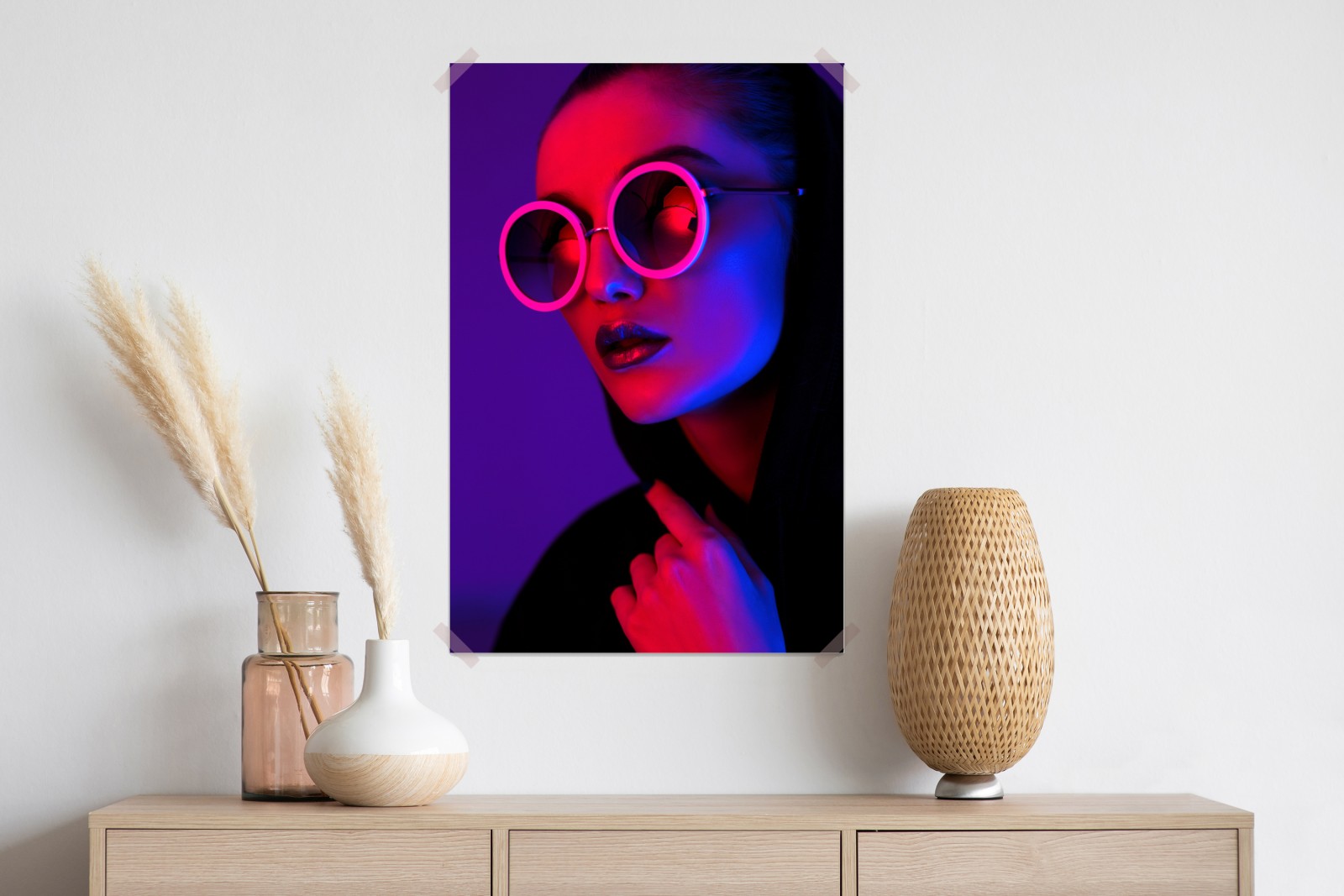 Dodaj energii wnętrzu dzięki neonowemu portretowi w intensywnych różowych i niebieskich tonach, idealny do nowoczesnych aranżacji.