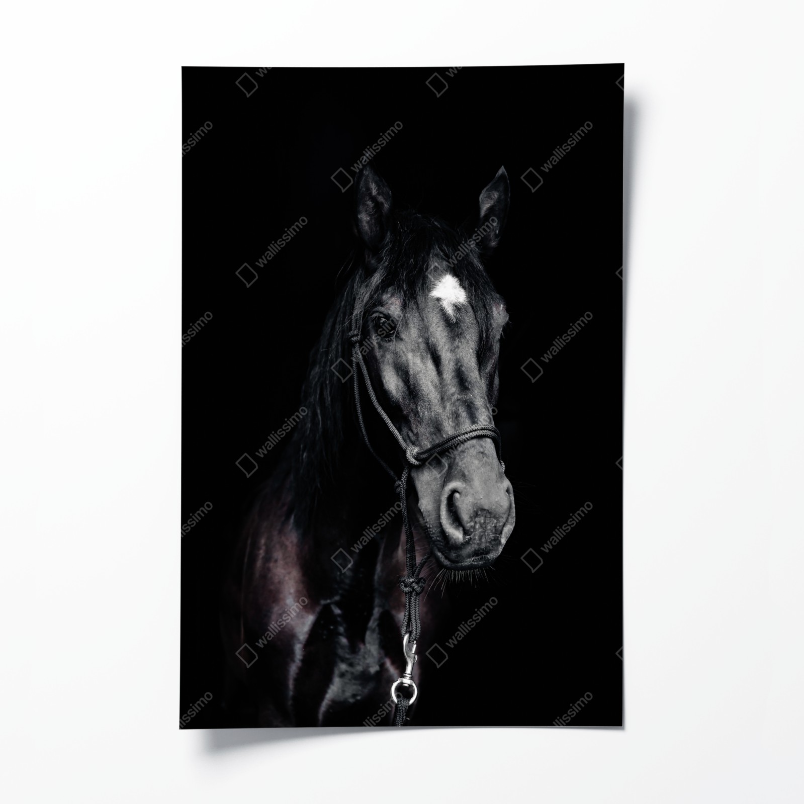 Elegancki portret konia z dramatycznym oświetleniem, który wprowadza ponadczasowy nastrój do wnętrza.