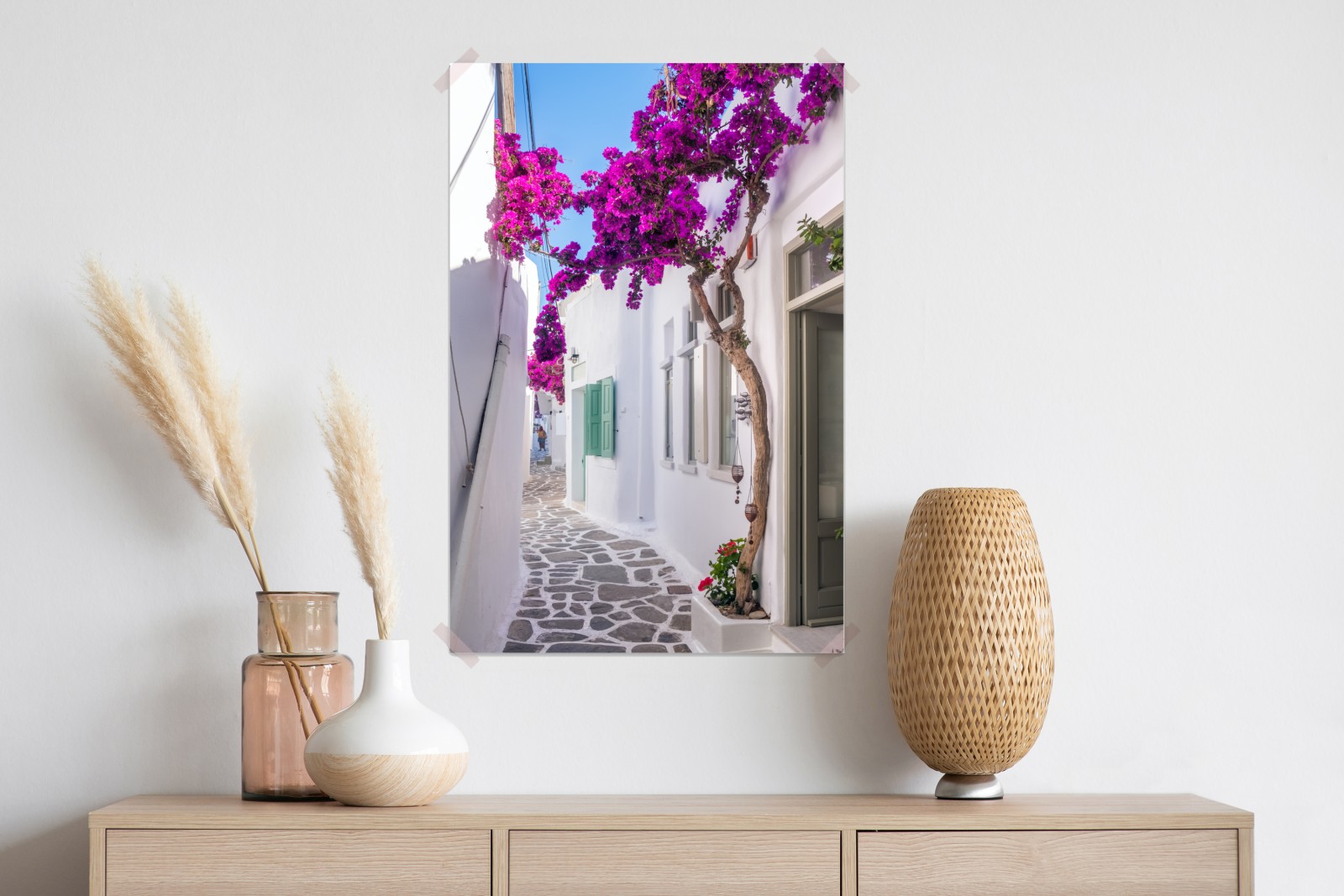 Wprowadź sielankowy urok słonecznej śródziemnomorskiej uliczki z żywą bugenwillą i czystą białą architekturą.