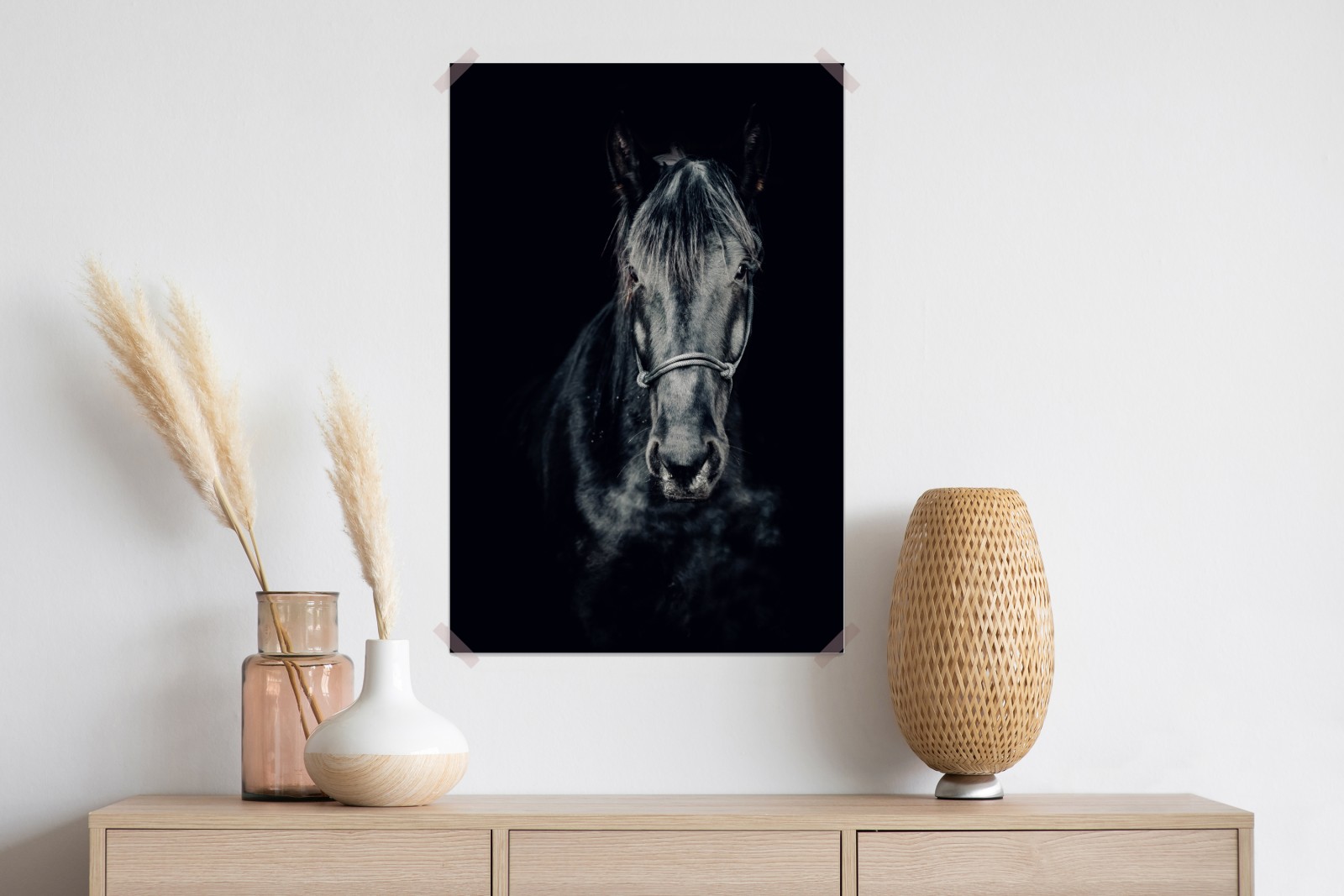 Dodaj wyrazisty akcent do wnętrza dzięki temu dramatycznemu portretowi czarnego konia, uchwyconemu w głębokim kontraście i nastrojowych tonach.