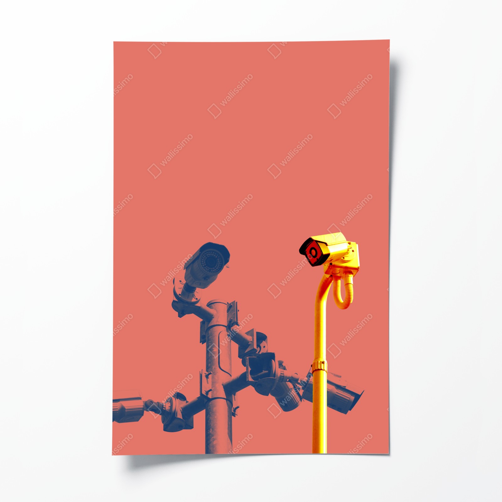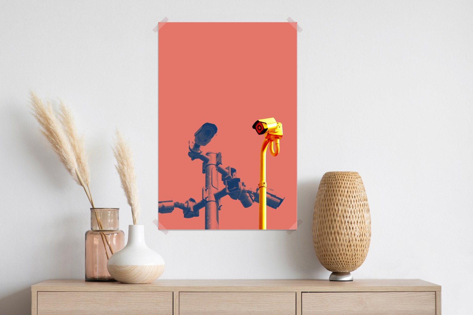 Wyrazista grafika w duotone z kamerami nadzoru na koralowym tle, idealna do nowoczesnych i miejskich wnętrz.
