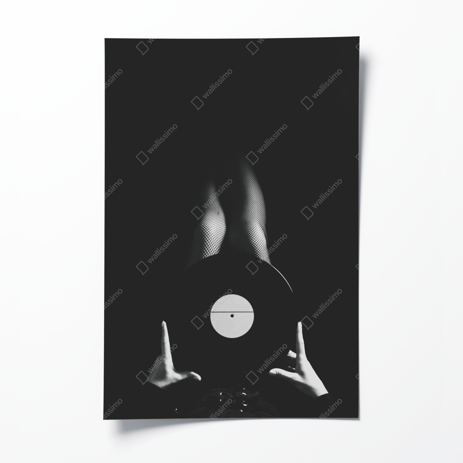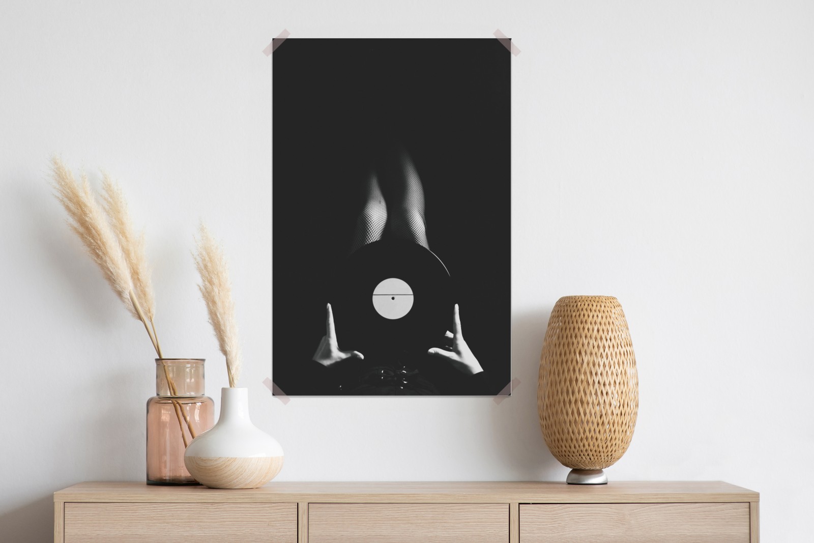 Dodaj retro klimat do wnętrza dzięki monochromatycznemu zdjęciu płyty winylowej trzymanej nad nogami w kabaretkach, idealne dla miłośników muzyki.