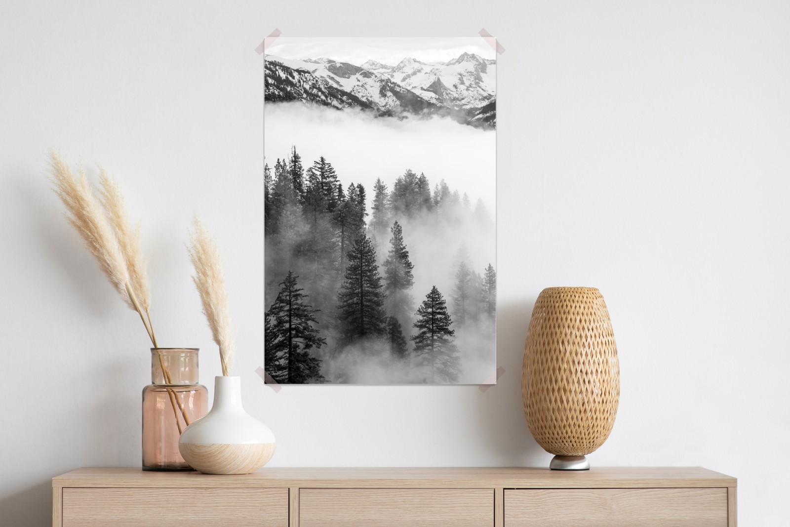Poczuj spokój górskiej mgły i potęgę sekwoi w tym dramatycznym czarno-białym obrazie, który doda głębi każdemu wnętrzu.