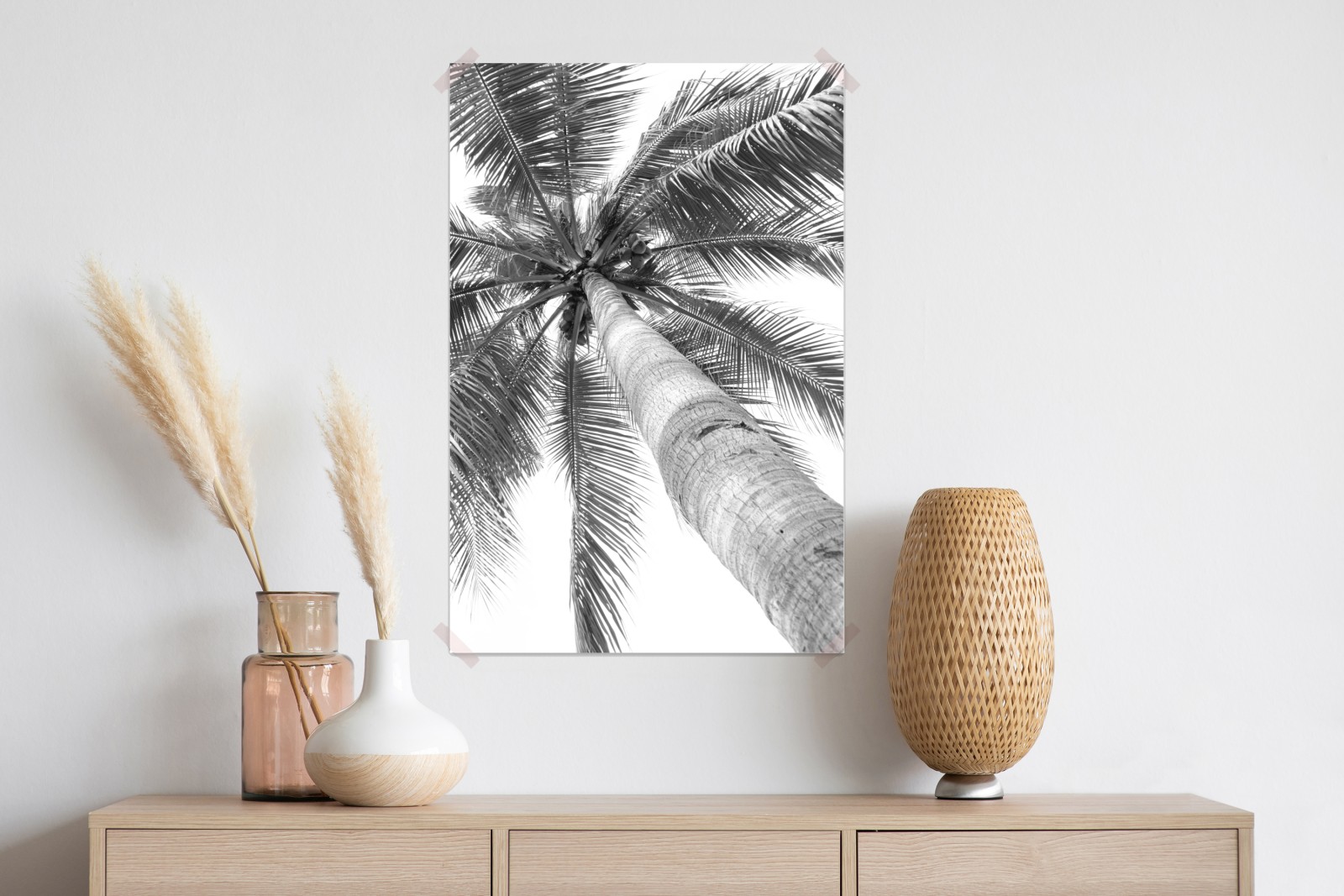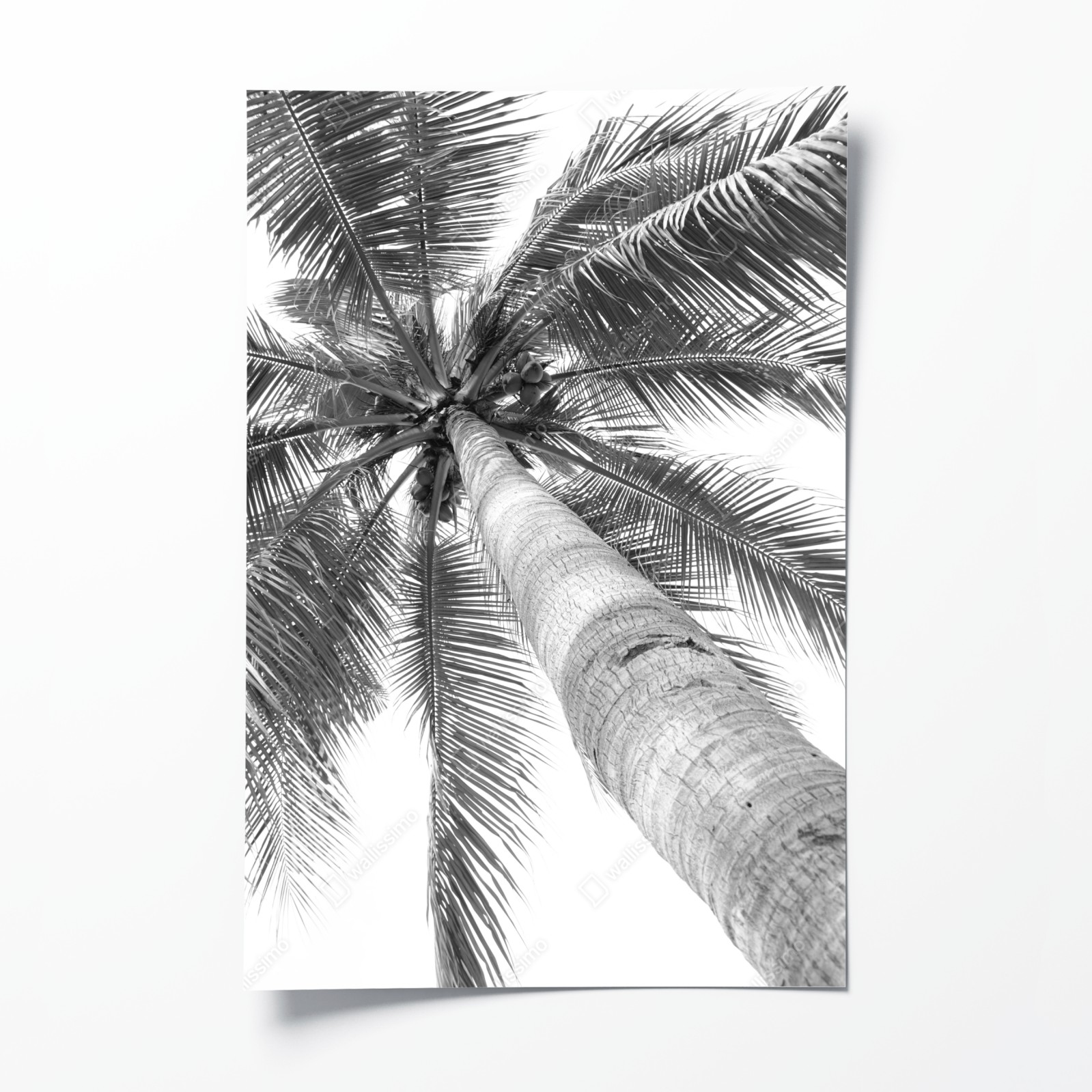 Dodaj uspokajający, tropikalny klimat do wnętrza dzięki tej efektownej, monochromatycznej fotografii palmy zrobionej z dołu.