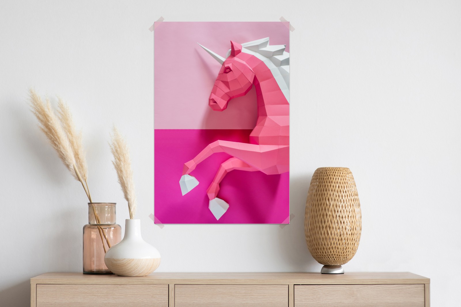 Dodaj odrobinę magii i koloru do pokoju dziecka dzięki temu geometrycznemu jednorożcowi; idealny do nowoczesnych wnętrz i kreatywnych przestrzeni.
