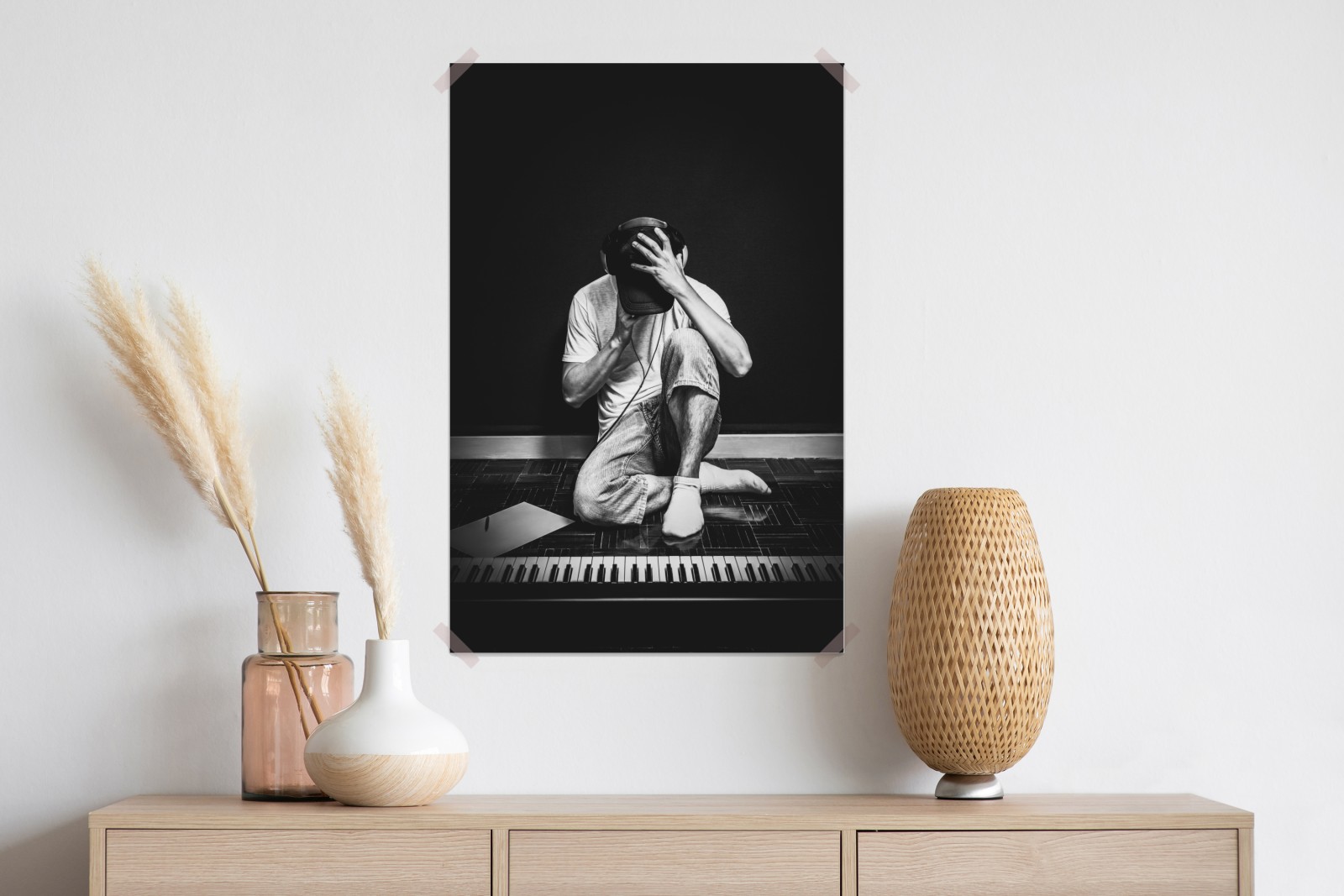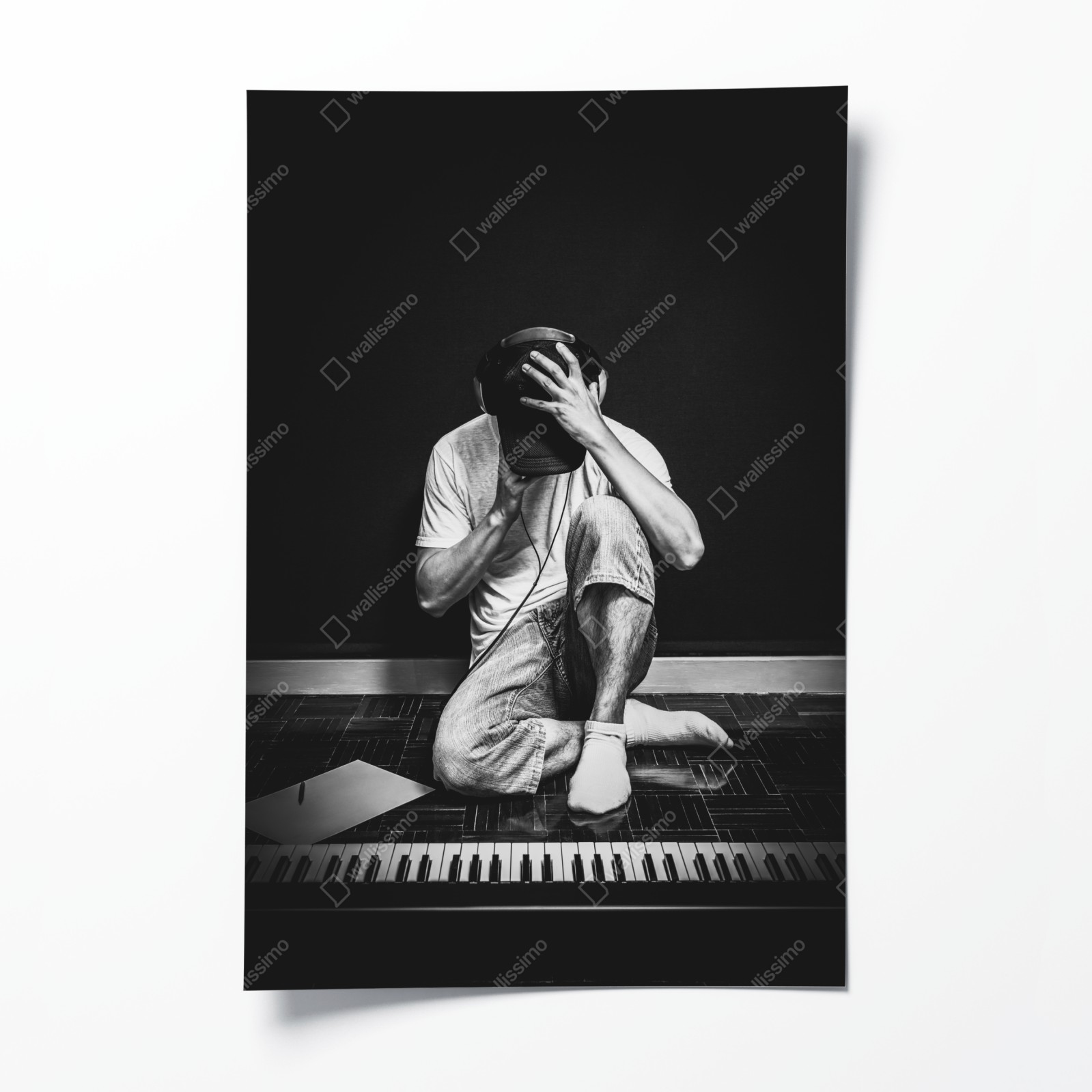 Dodaj do wnętrza klimatyczny, monochromatyczny portret muzyka przy klawiaturze.