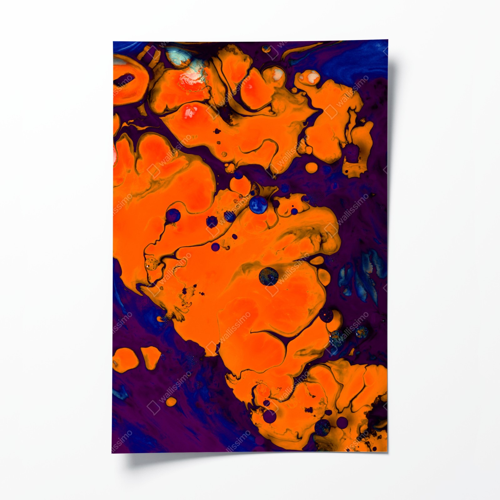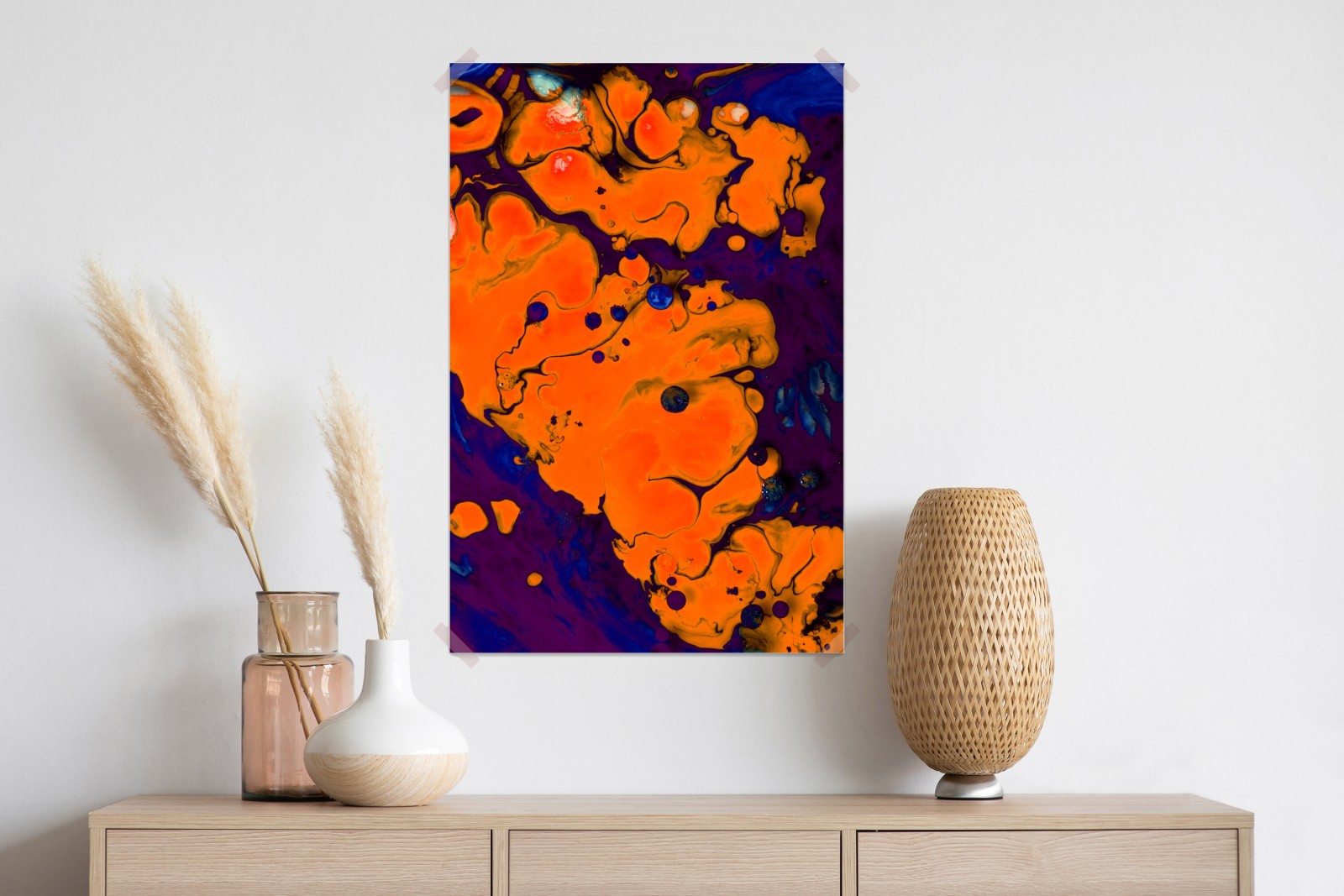 Ożyw swoje wnętrze dzięki żywej abstrakcyjnej kompozycji w płynnych pomarańczowych i głębokich fioletowych tonach, idealnej do nowoczesnych wnętrz.