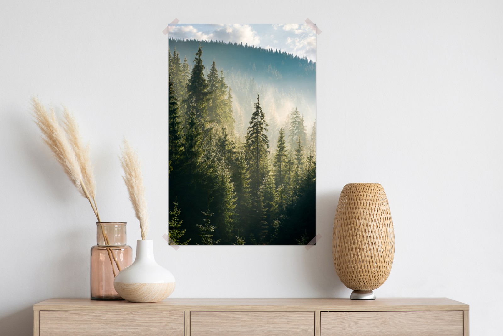 Wprowadź spokój natury do wnętrza dzięki temu mglistemu świerkowemu lasowi w delikatnym porannym świetle.