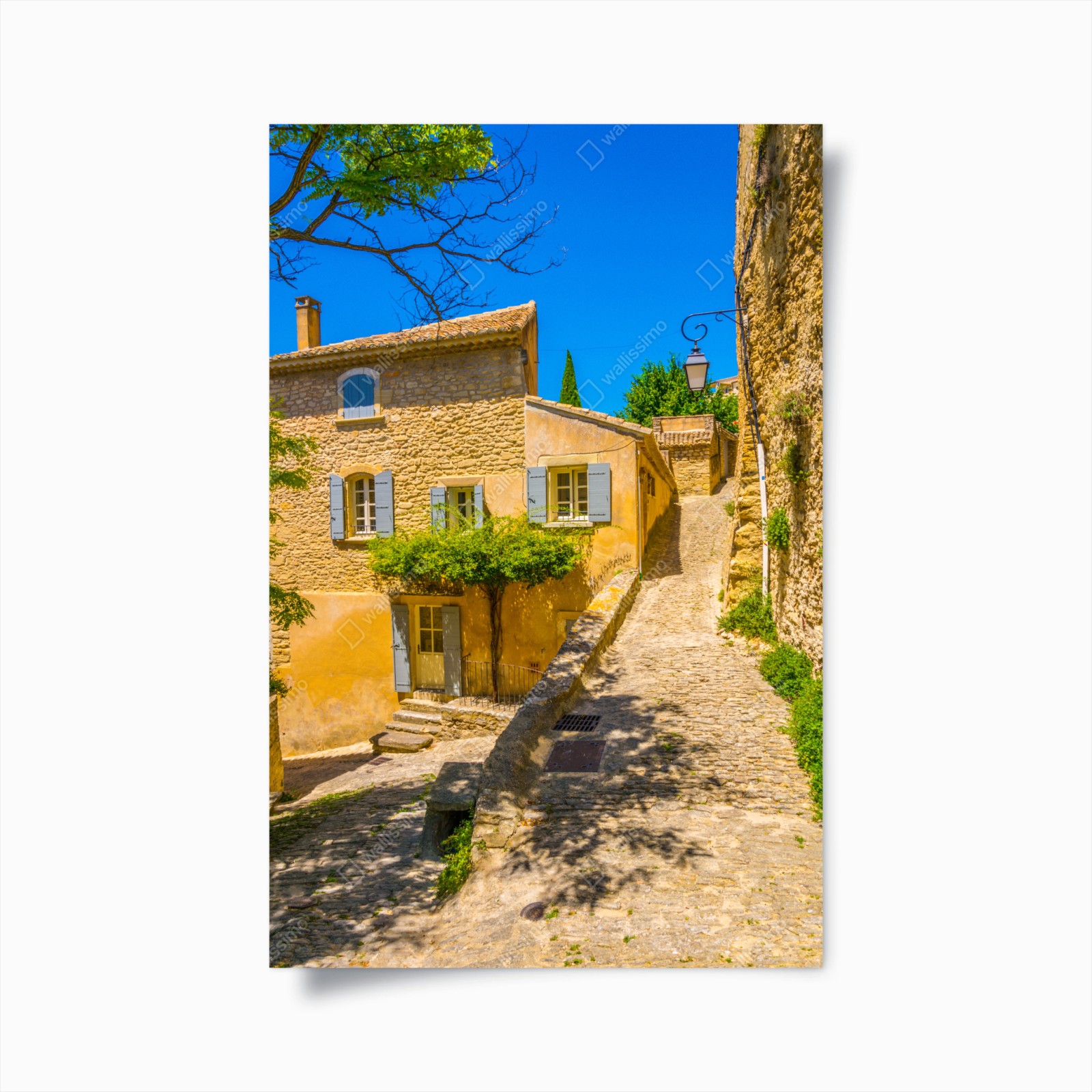 - podróże, lato, słońce, śródziemnomorskie, stare miasto, brukowana uliczka, niebieskie okiennice, prowansalska wioska, kamienny dom, rustykalna architektura