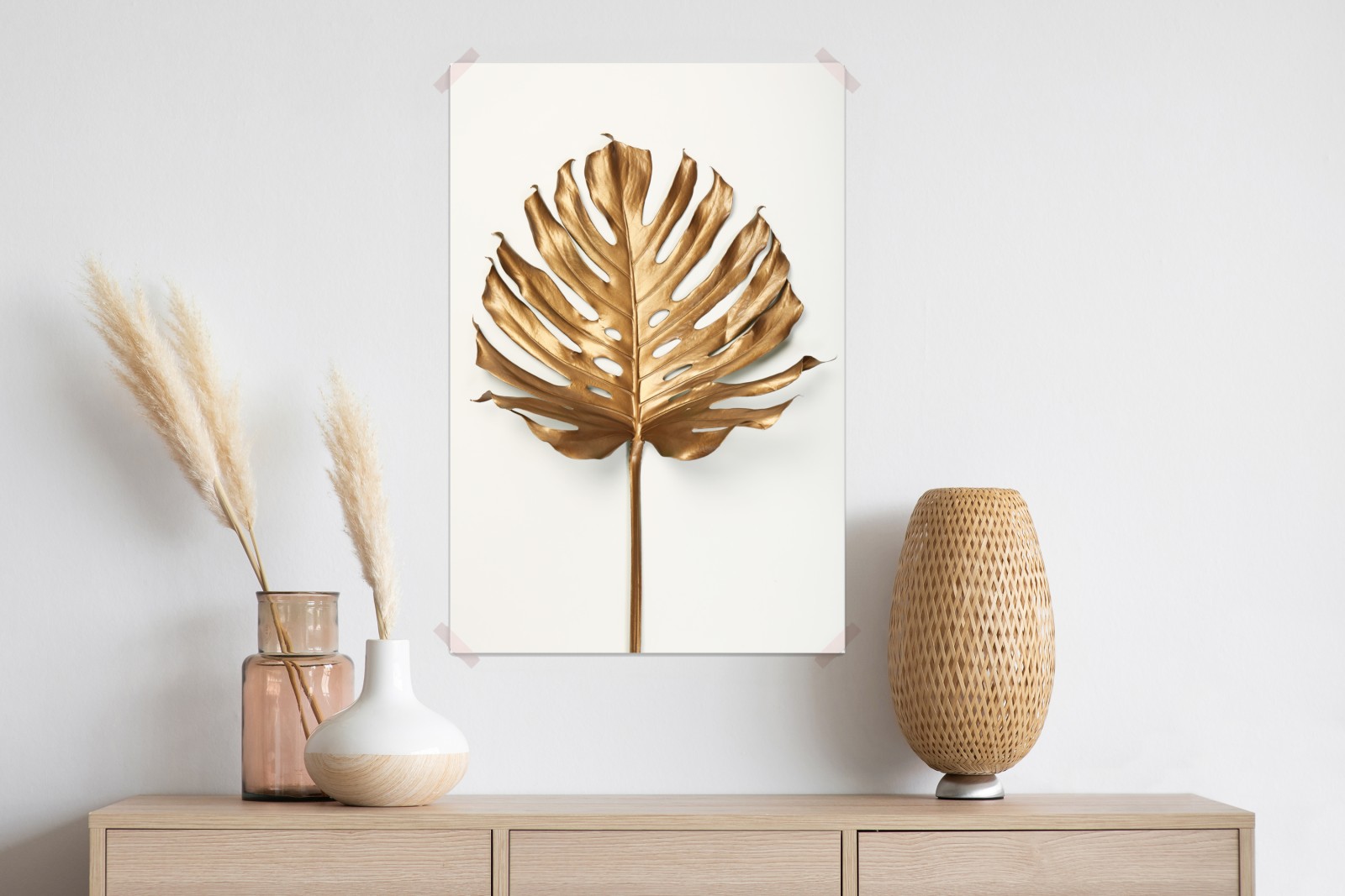 Dodaj elegancji wnętrzu dzięki złotemu liściowi monstera na czystym białym tle, idealnemu do nowoczesnych i art deco aranżacji.