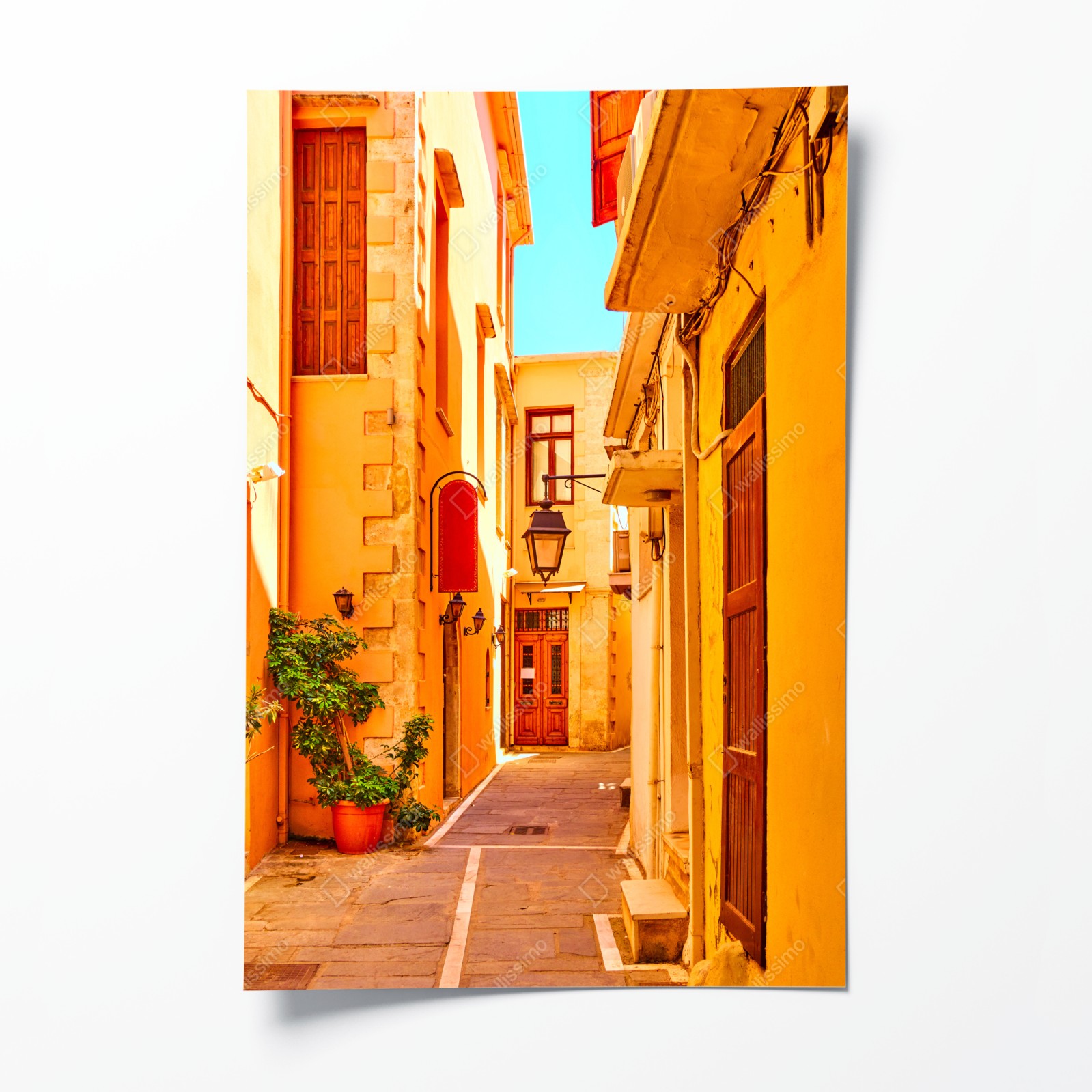 Dodaj śródziemnomorskiego uroku do wnętrza dzięki słonecznej uliczce w Rethymno, Kreta; ciepłe żółte fasady i klasyczne latarnie tworzą przytulny, podróżniczy klimat.