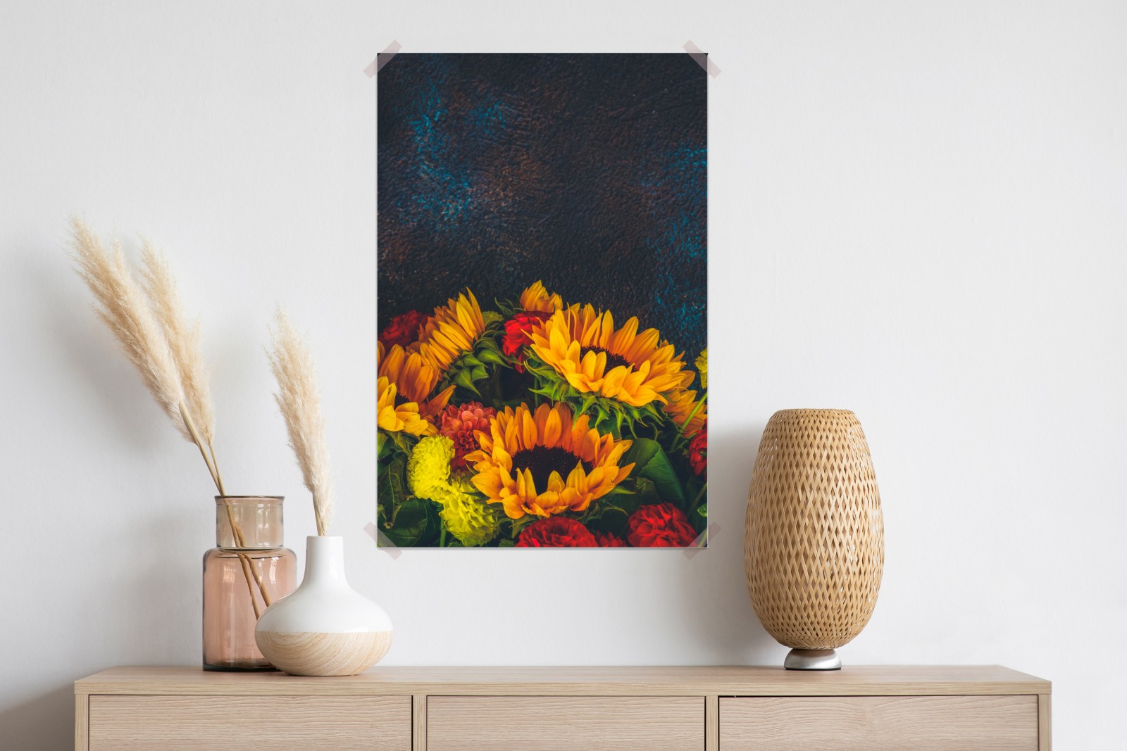 Plakat Żywy bukiet słoneczników na ciemnym tle