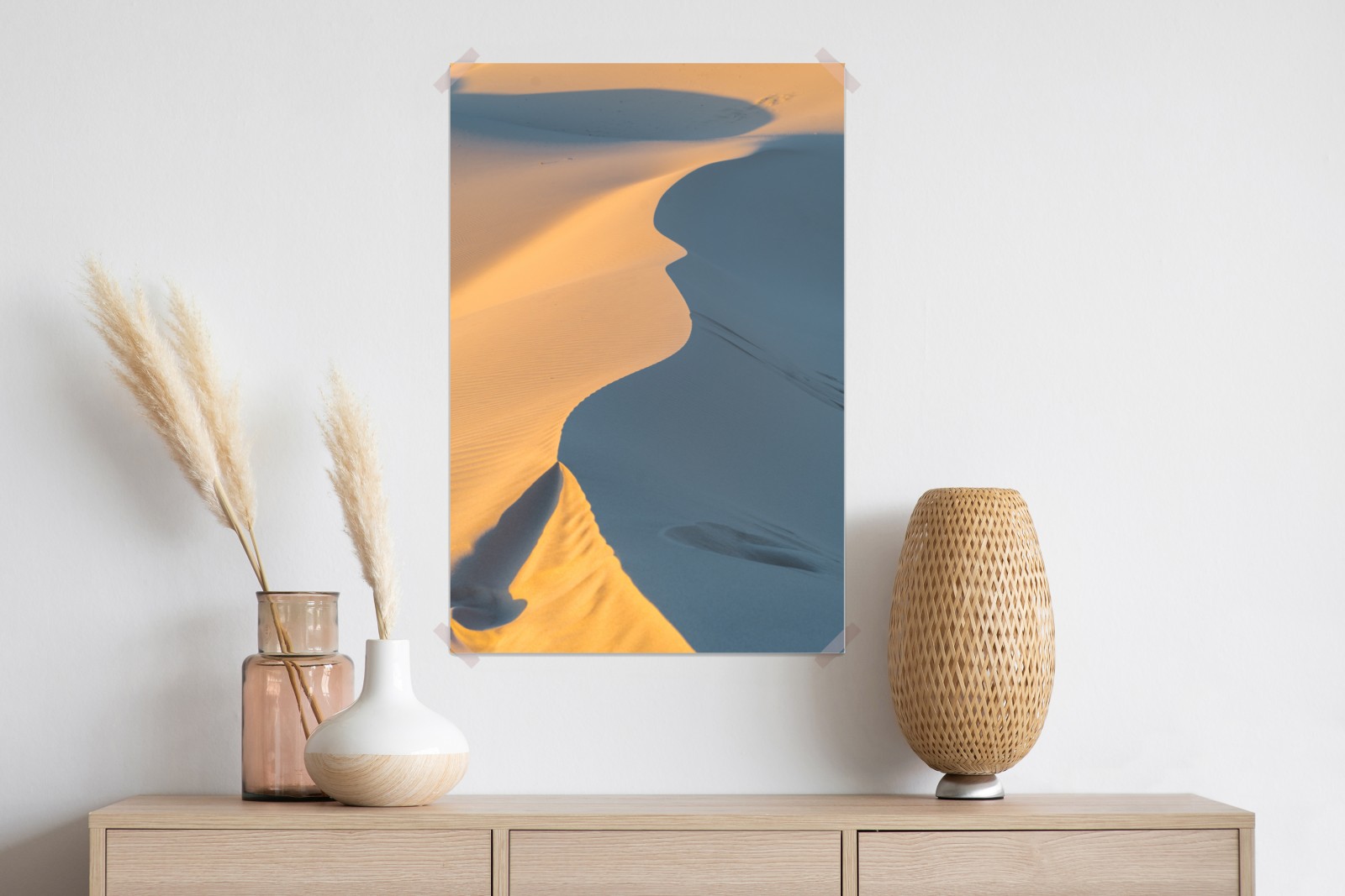 Wprowadź spokojną pustynną elegancję do wnętrza dzięki złotym wydmom i miękkim niebieskim cieniom, minimalistyczny pejzaż dodający spokoju i faktury każdemu pomieszczeniu.