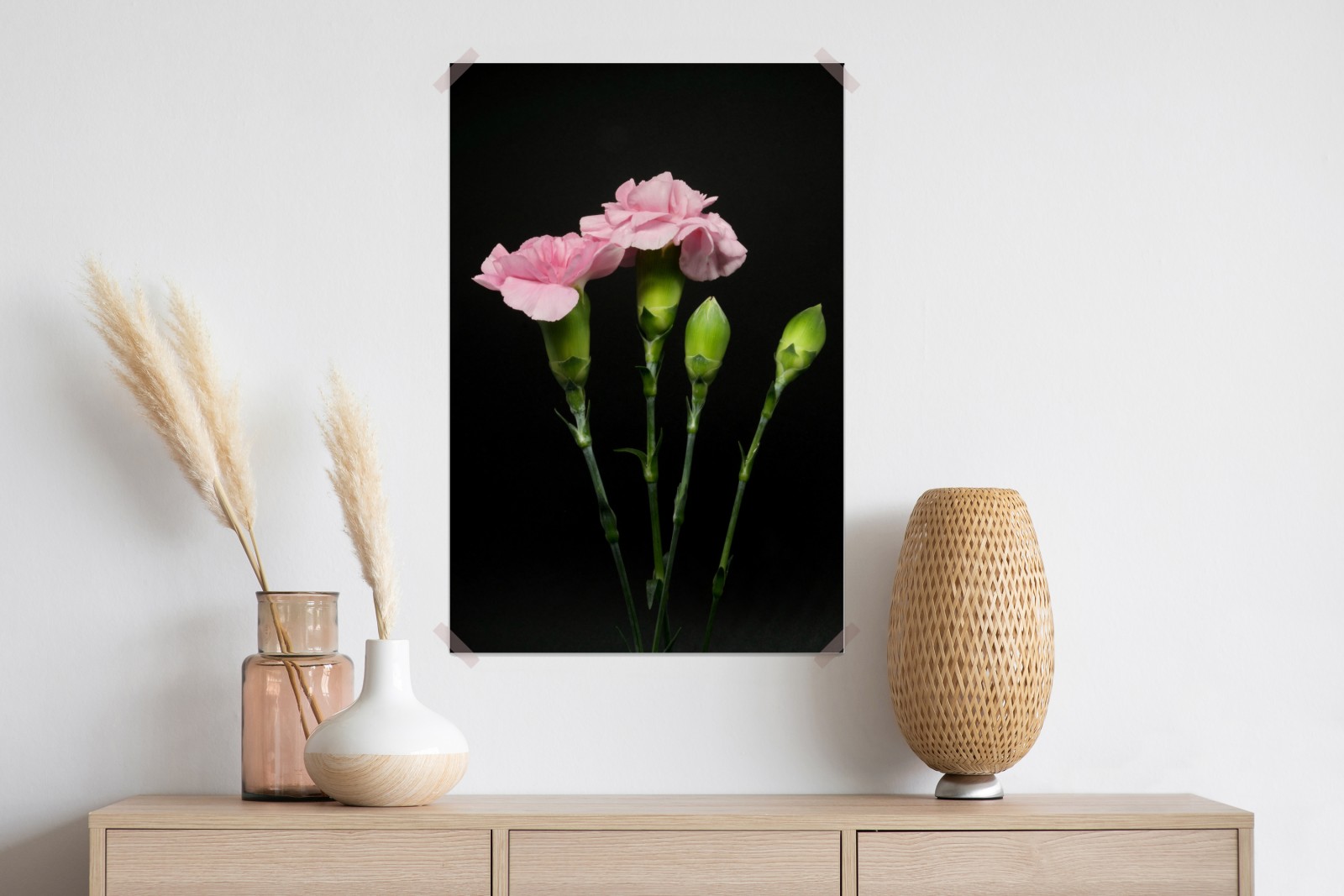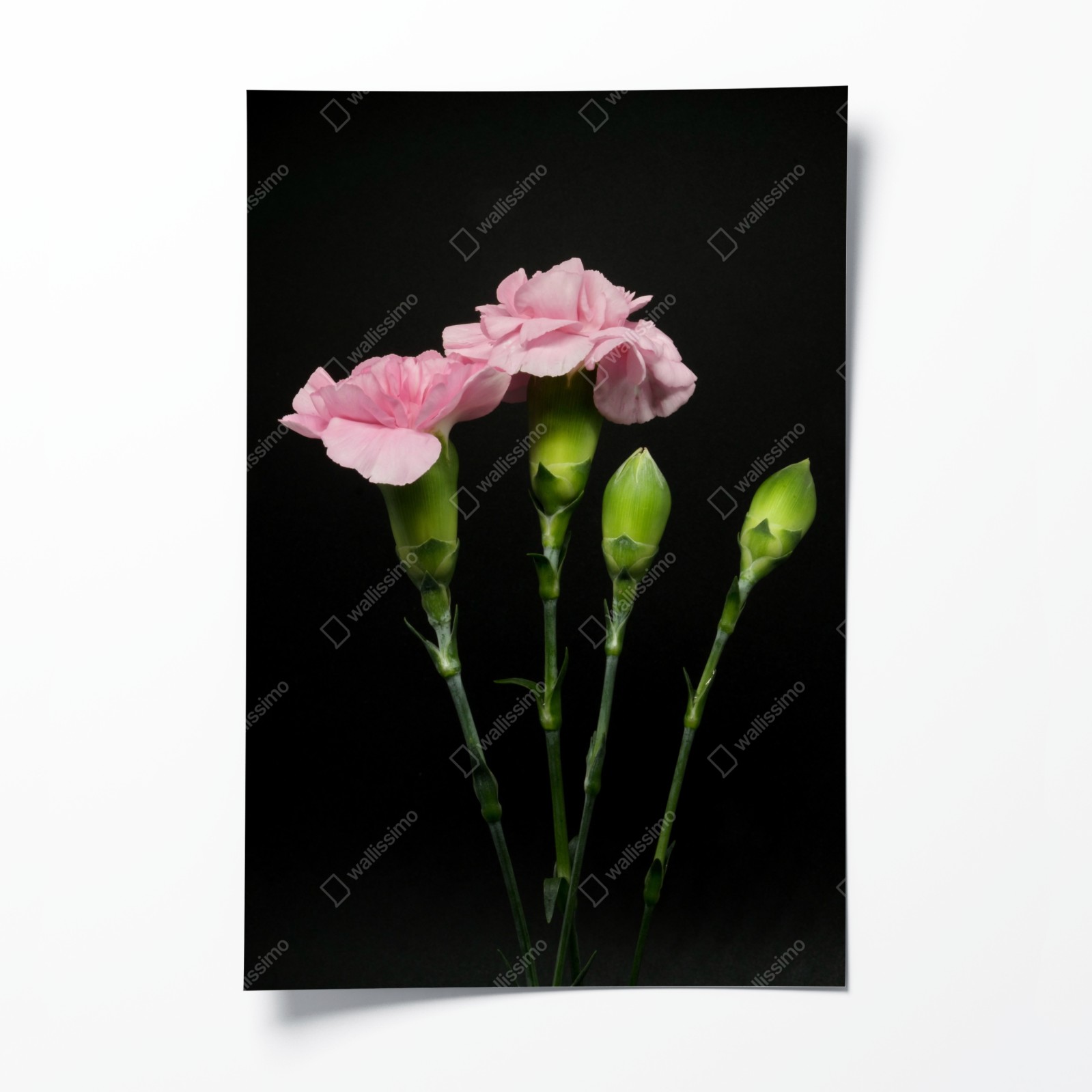 Dodaj subtelnej elegancji wnętrzu dzięki różowym goździkom na kontrastującym czarnym tle.