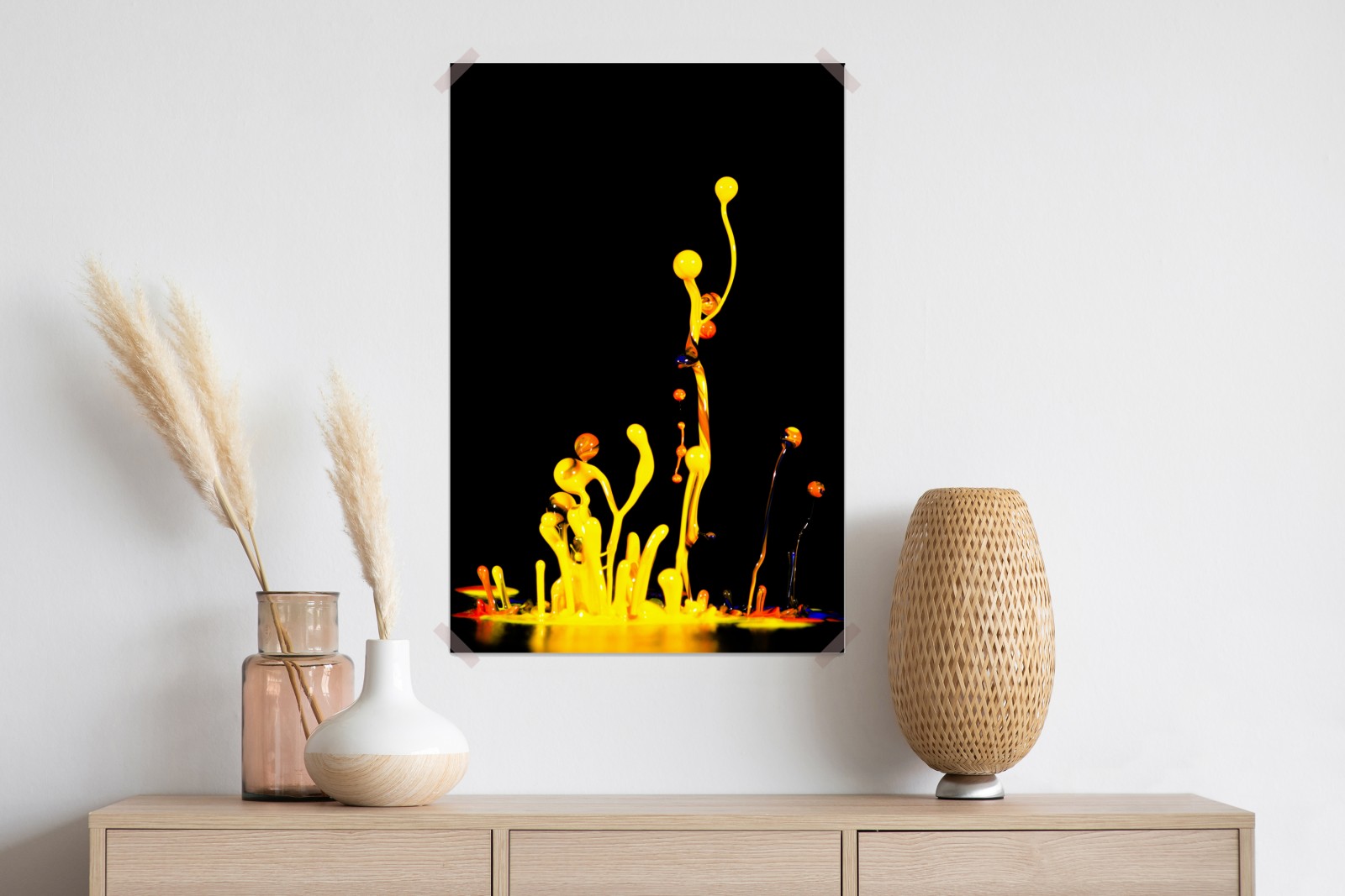 Plakat Intensywny żółty rozbryzg farby na czarnym tle