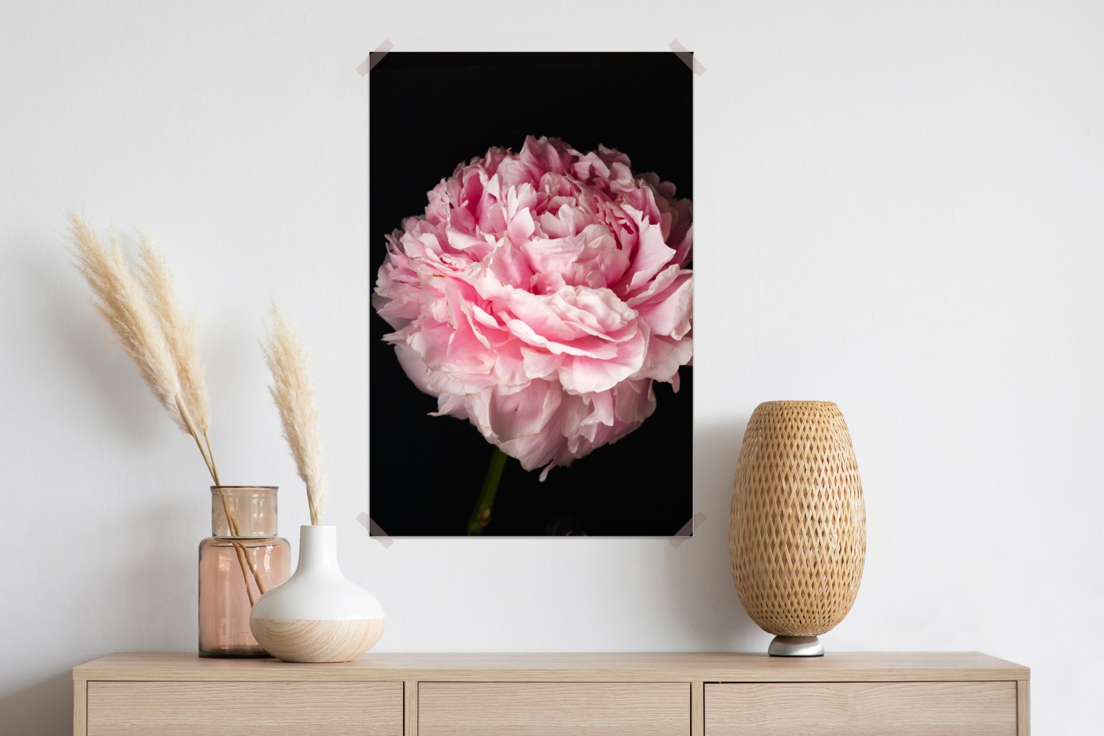 Delikatna różowa piwonia w pełnym rozkwicie dodaje wnętrzu elegancji i spokoju, idealna jako dekoracja ścienna.