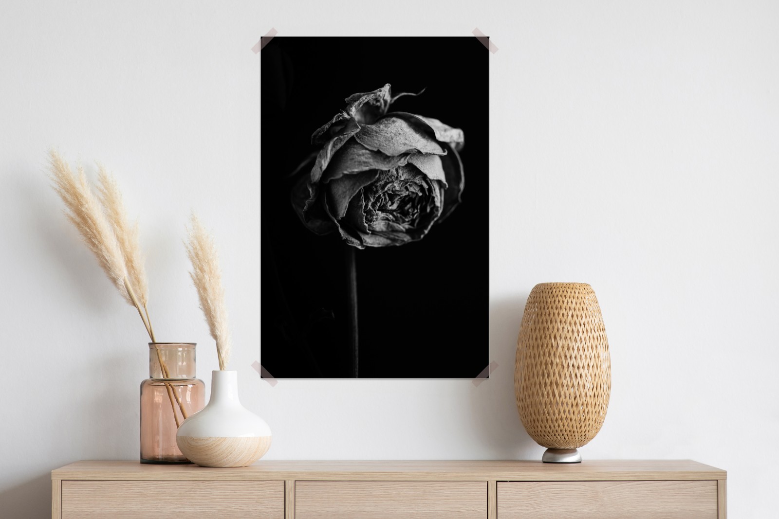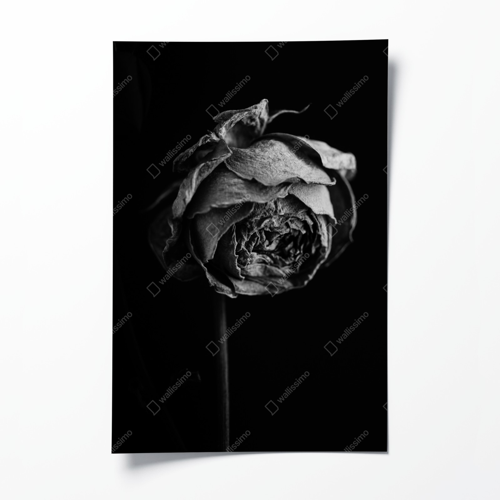 Odkryj ponadczasowe piękno na tej monochromatycznej fotografii suszonej róży, idealnej do minimalistycznych wnętrz i nastrojowej dekoracji.