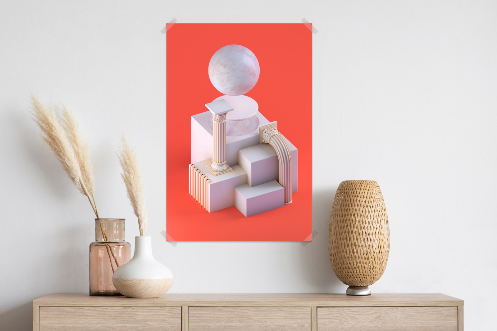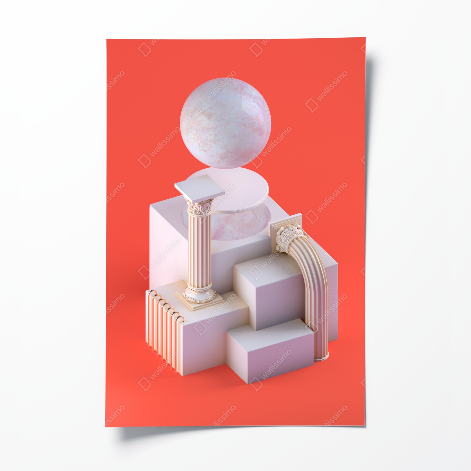 Dodaj nowoczesny akcent dzięki minimalistycznej kompozycji 3D z marmurowymi teksturami i rzeźbiarskimi kolumnami na intensywnym pomarańczowym tle.