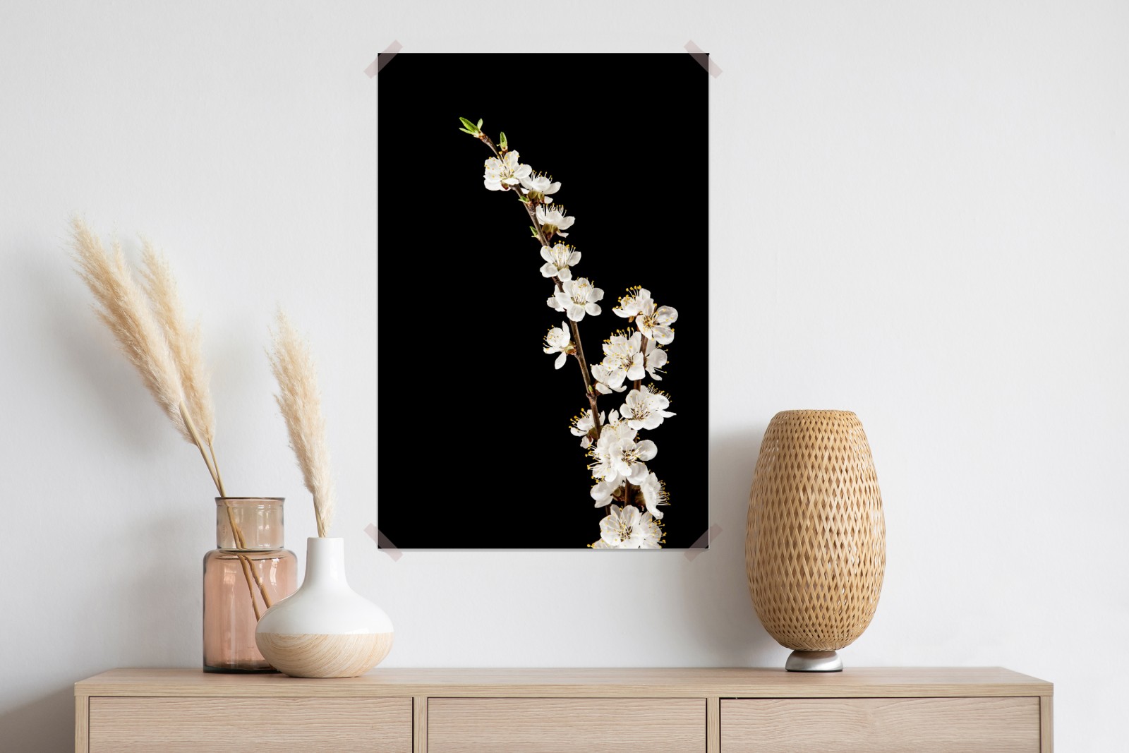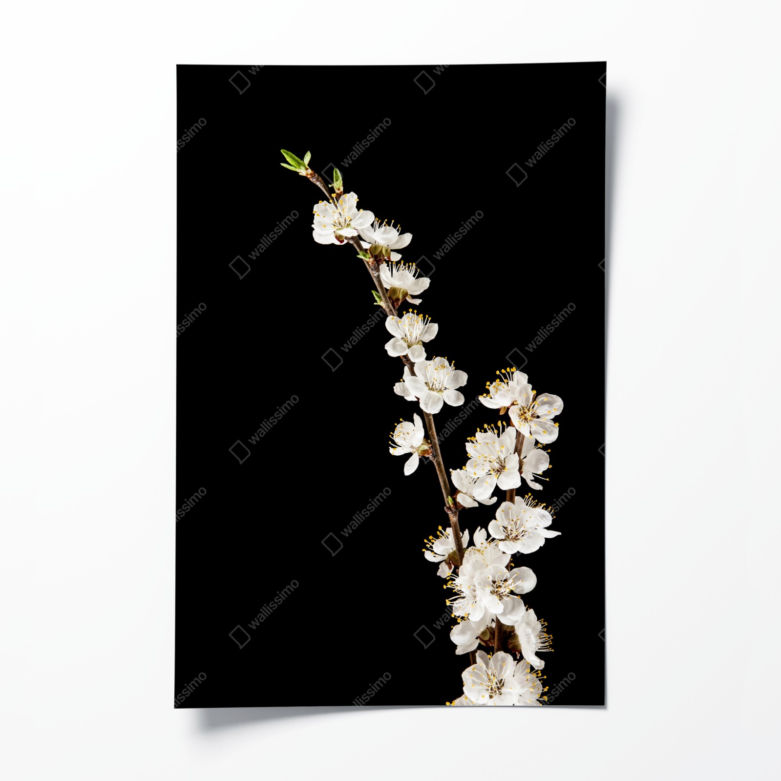 Plakat Delikatna gałązka kwitnącej moreli na czarnym tle