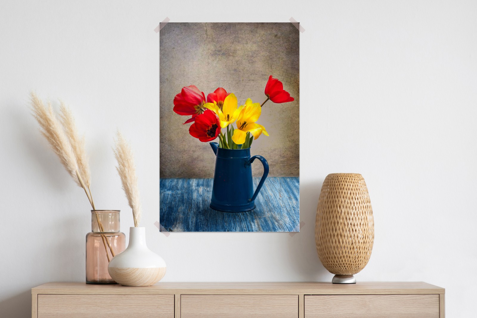 Plakat Kolorowy bukiet tulipanów w niebieskim dzbanku