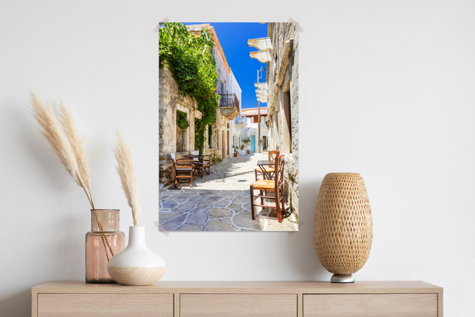 Wprowadź słoneczną śródziemnomorską uliczkę do wnętrza dzięki temu żywemu obrazowi z kamiennymi domami i przytulnymi krzesłami kawiarnianymi.