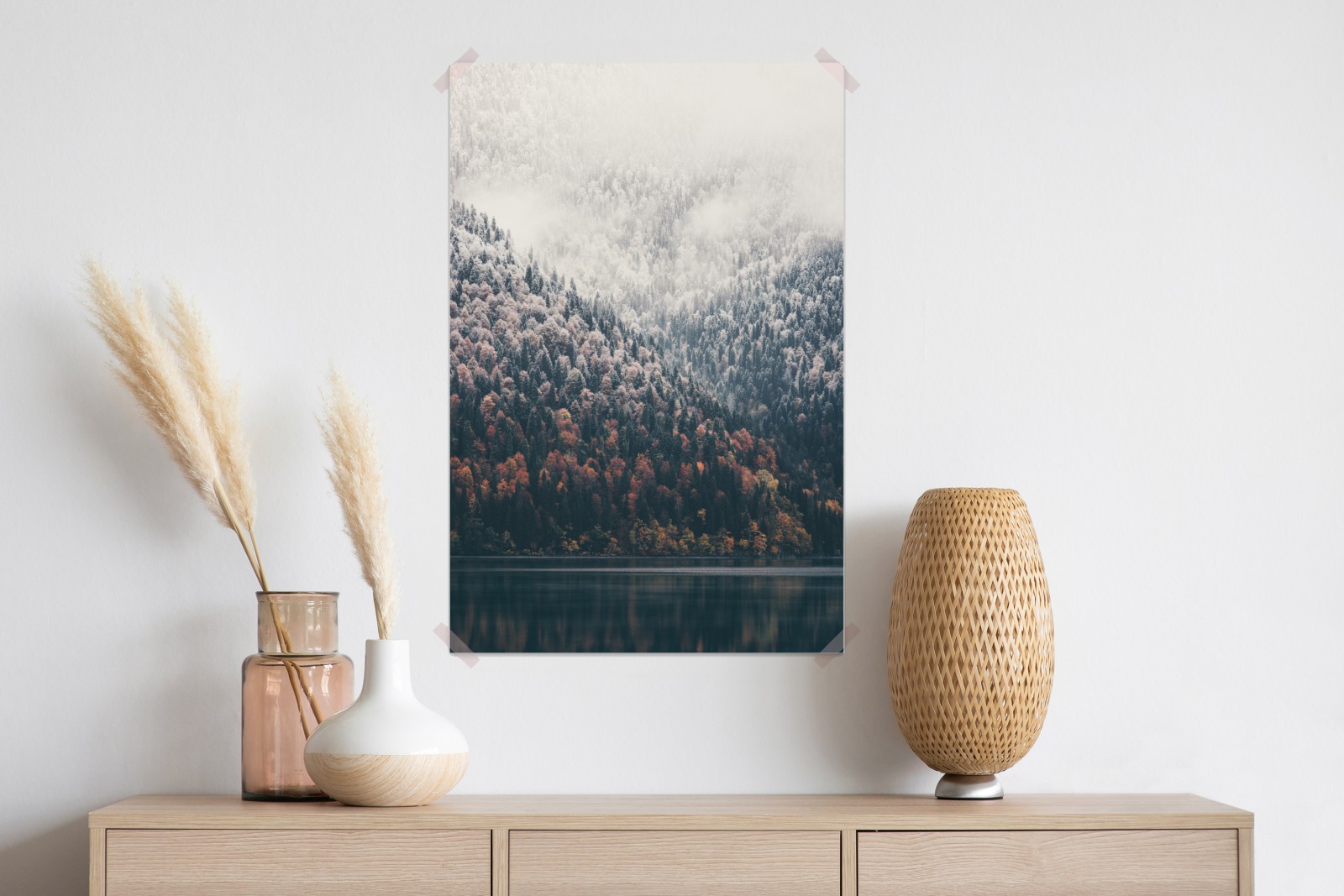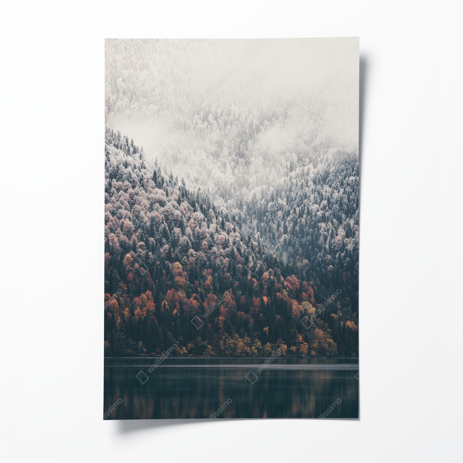 Wprowadź do wnętrza spokój i naturę dzięki tej scenie górskiego lasu w jesiennej mgle z odbiciem w jeziorze.