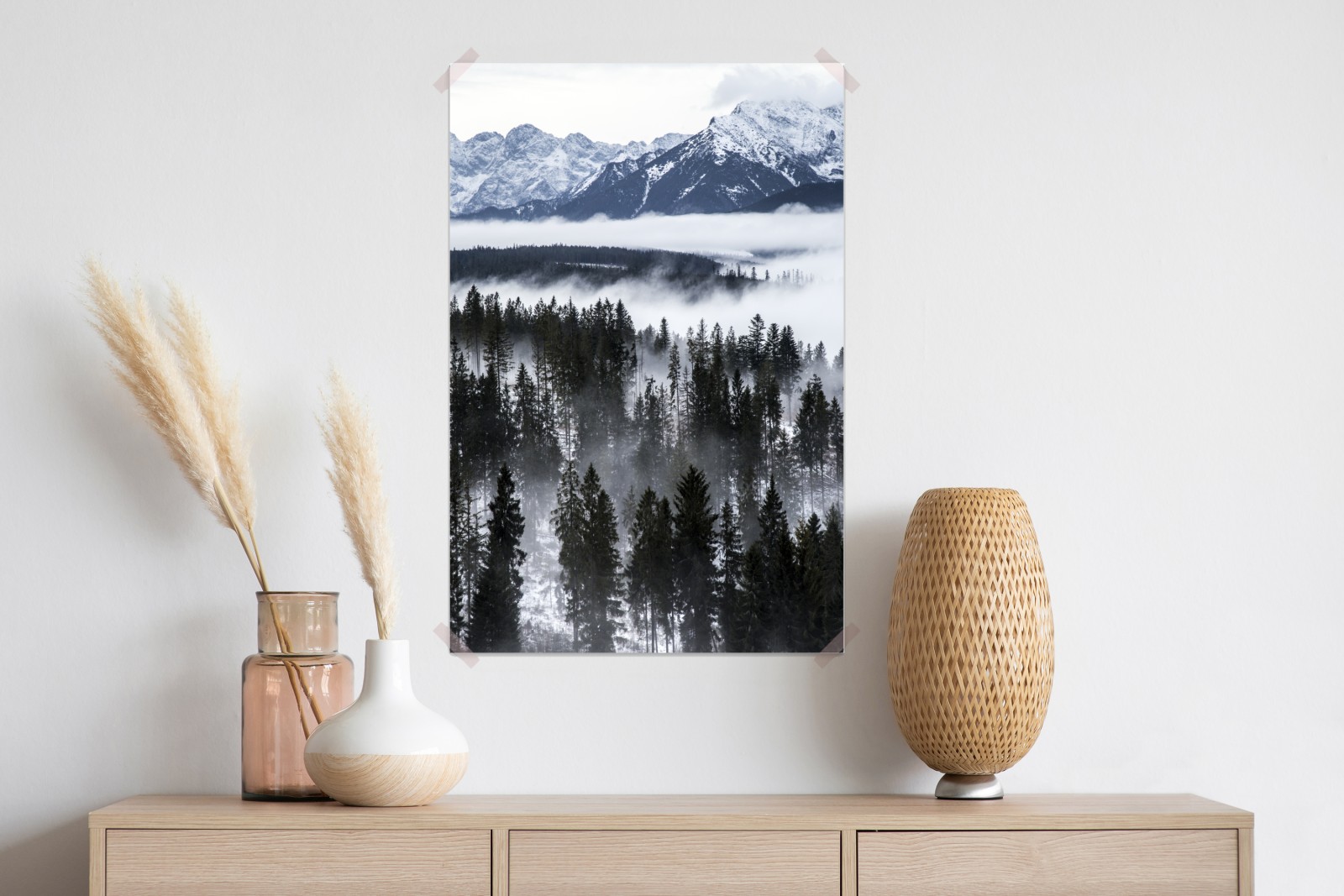 Odkryj spokojny klimat Tatr pokrytych śniegiem i mgłą, idealny obraz do stworzenia przytulnej atmosfery w pomieszczeniu.