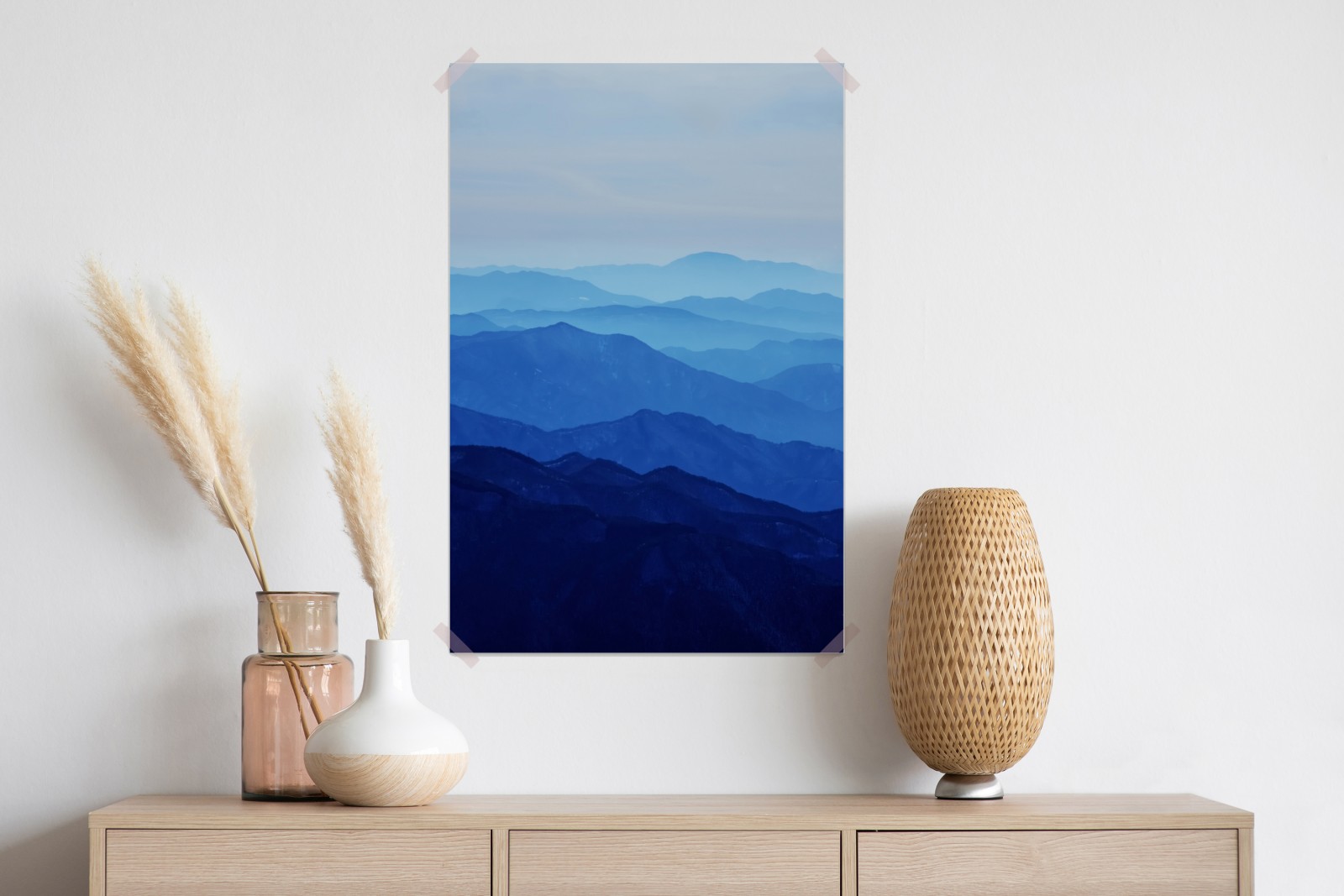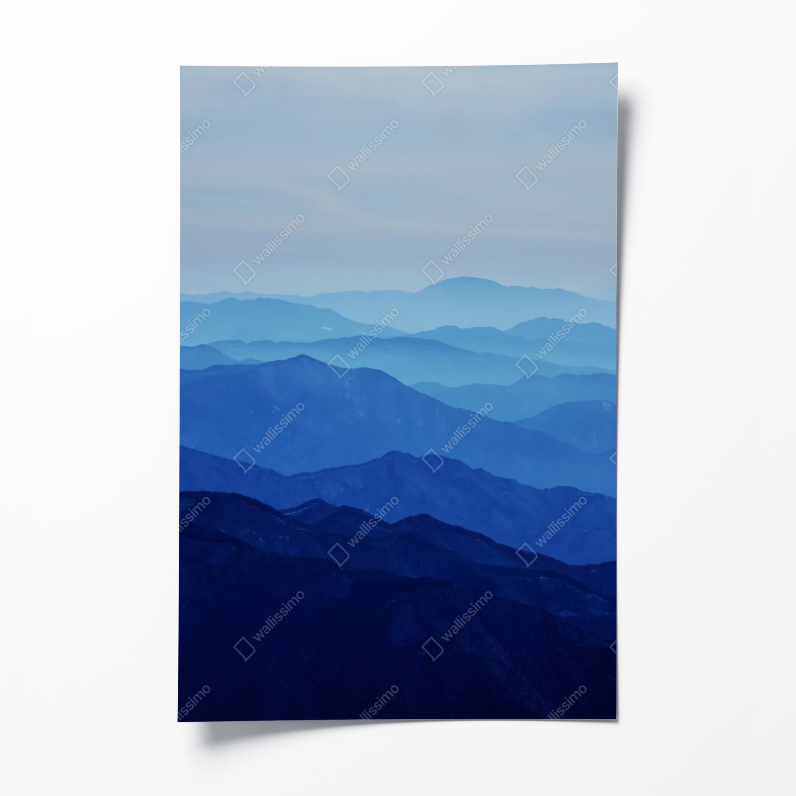Wprowadź spokój do wnętrza dzięki tej mglistej niebieskiej panoramie gór z warstwowymi szczytami i delikatną atmosferą.
