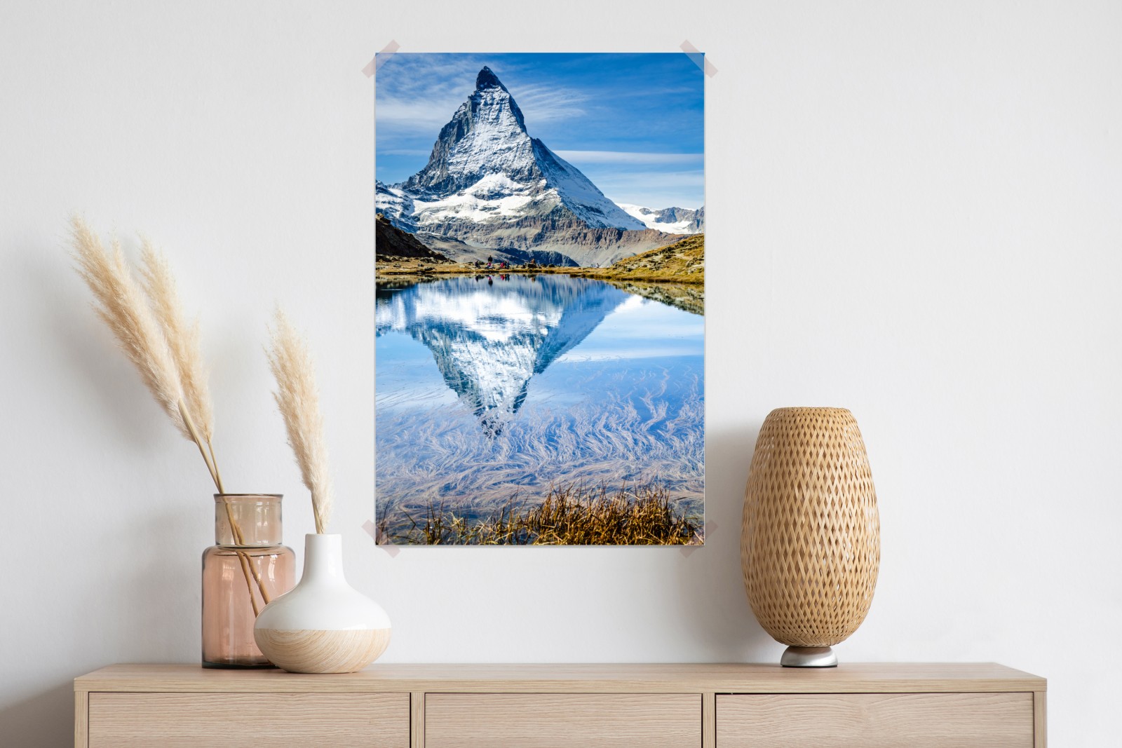 Wprowadź spokojne alpejskie piękno do wnętrza dzięki ostremu szczytowi odbitemu w spokojnym jeziorze, przynoszącym kojące błękitne tonacje i naturalną wielkość.
