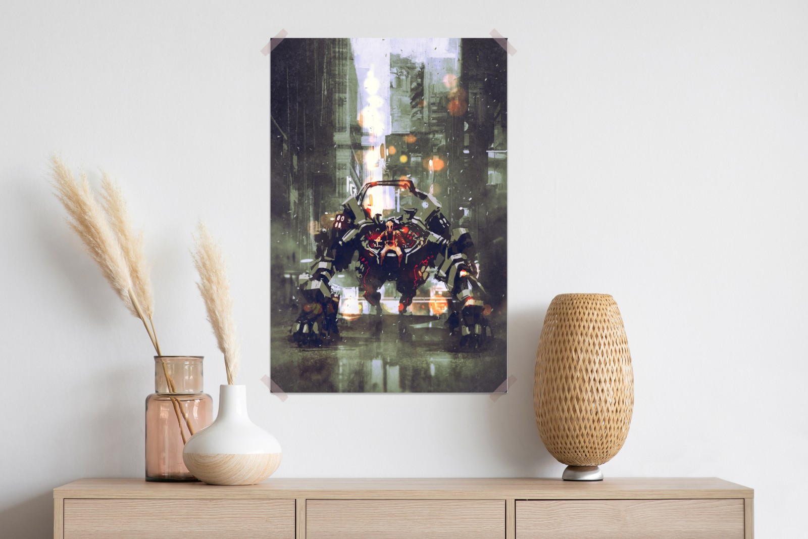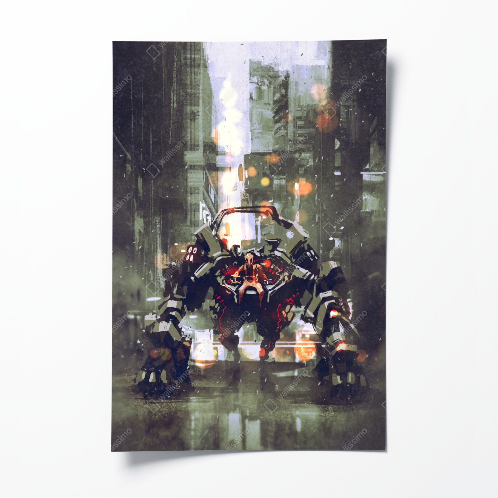 Dodaj do wnętrza dramatyczny mech w stylu cyberpunk dzięki tej atmosferycznej ilustracji akwarelowej, idealnej dla fanów sci-fi.