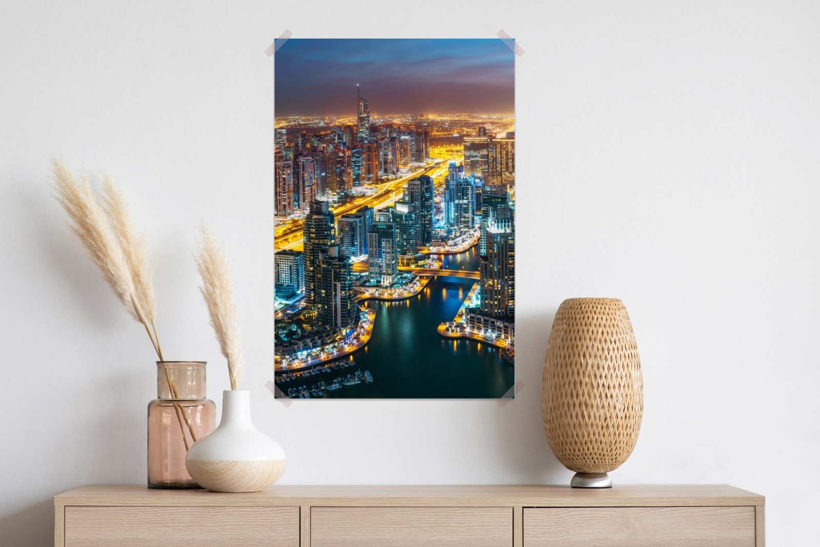 Poczuj tętno życia Dubai Marina nocą dzięki temu obrazowi z rozświetlonymi wieżowcami, idealny do nowoczesnych wnętrz.