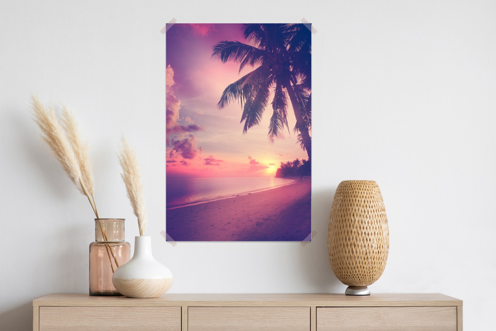 Dodaj do wnętrza ciepły, tropikalny klimat dzięki temu retro obrazowi plaży z sylwetkami palm i pastelowymi barwami.