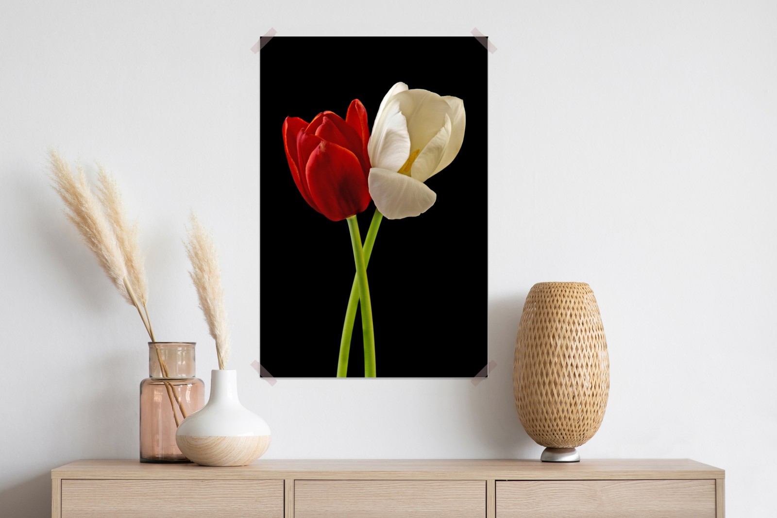 Eleganckie czerwono-białe tulipany na czarnym tle wprowadzą ponadczasowe piękno i minimalistyczny urok do każdego wnętrza.