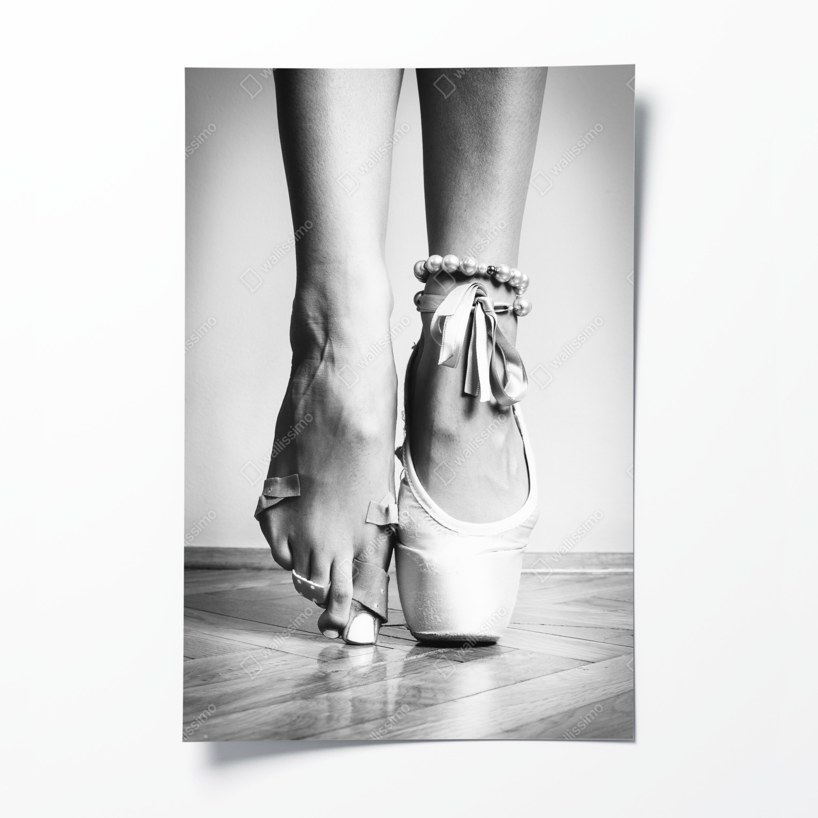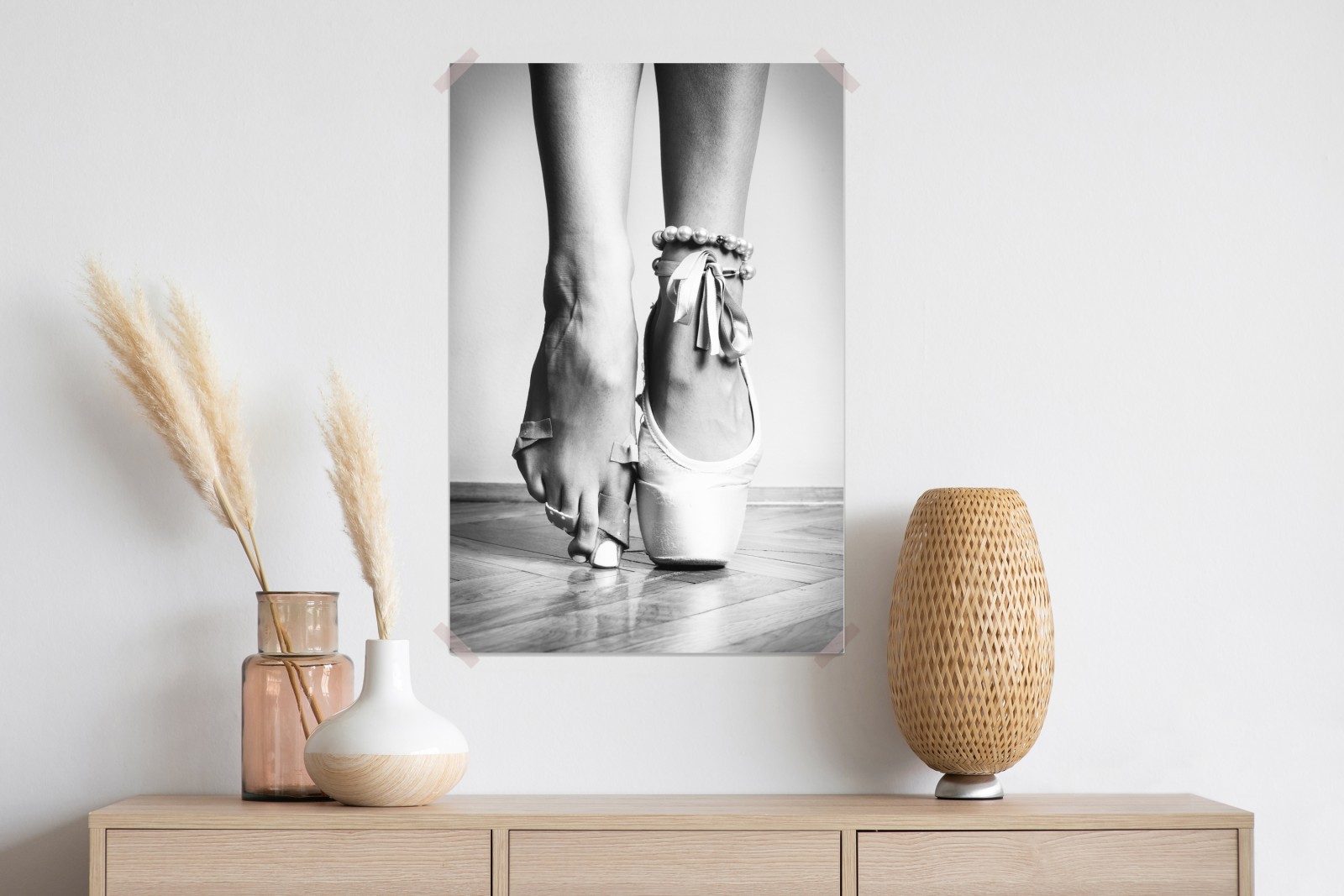 Celebruj piękno i dyscyplinę tańca dzięki temu wyrazistemu czarno-białemu wydrukowi przedstawiającemu stopę baletnicy na pointach; minimalistyczna kompozycja doda ponadczasowej elegancji do sypialni lub studia.
