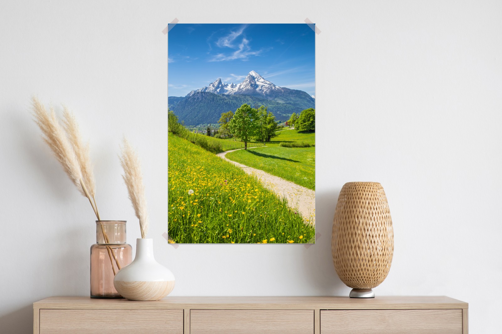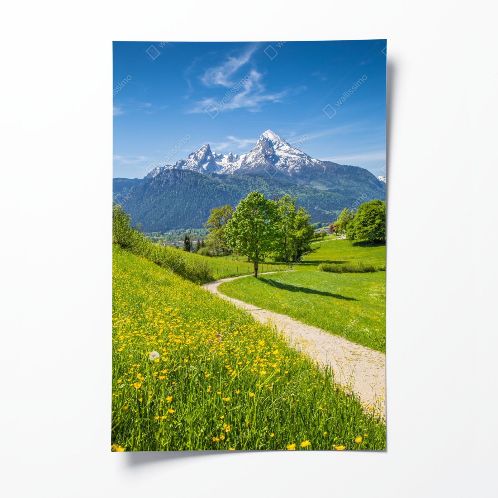 Wprowadź spokój alpejskich łąk do wnętrza dzięki temu żywemu pejzażowi z krętą ścieżką, polnymi kwiatami i ośnieżonymi szczytami.