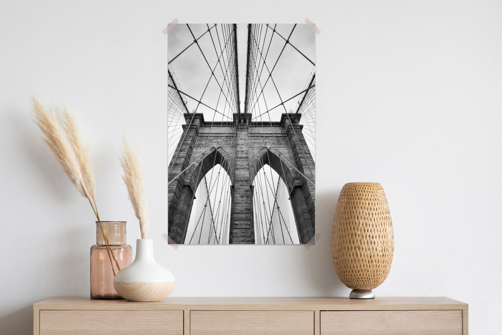 Odśwież swoje wnętrze wyrazistą czarno-białą perspektywą Mostu Brooklyńskiego, która wnosi ponadczasową elegancję i nowoczesną prostotę.