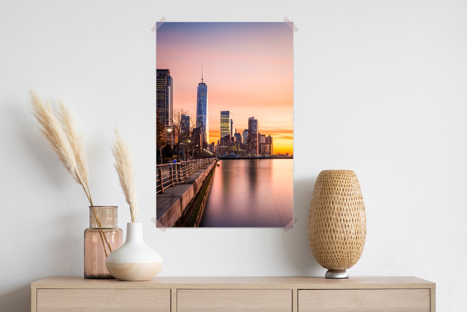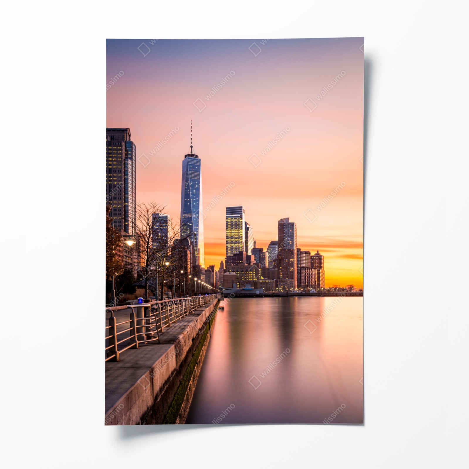 Dodaj swojemu wnętrzu miejskiego charakteru dzięki tej spokojnej panoramie Dolnego Manhattanu o złocistym zachodzie słońca.