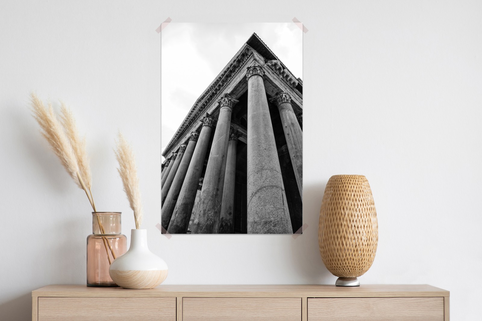 Dodaj dramatyzmu wnętrzu dzięki czarno-białemu widokowi monumentalnych kolumn Panteonu w Rzymie, idealny do nowoczesnych aranżacji.