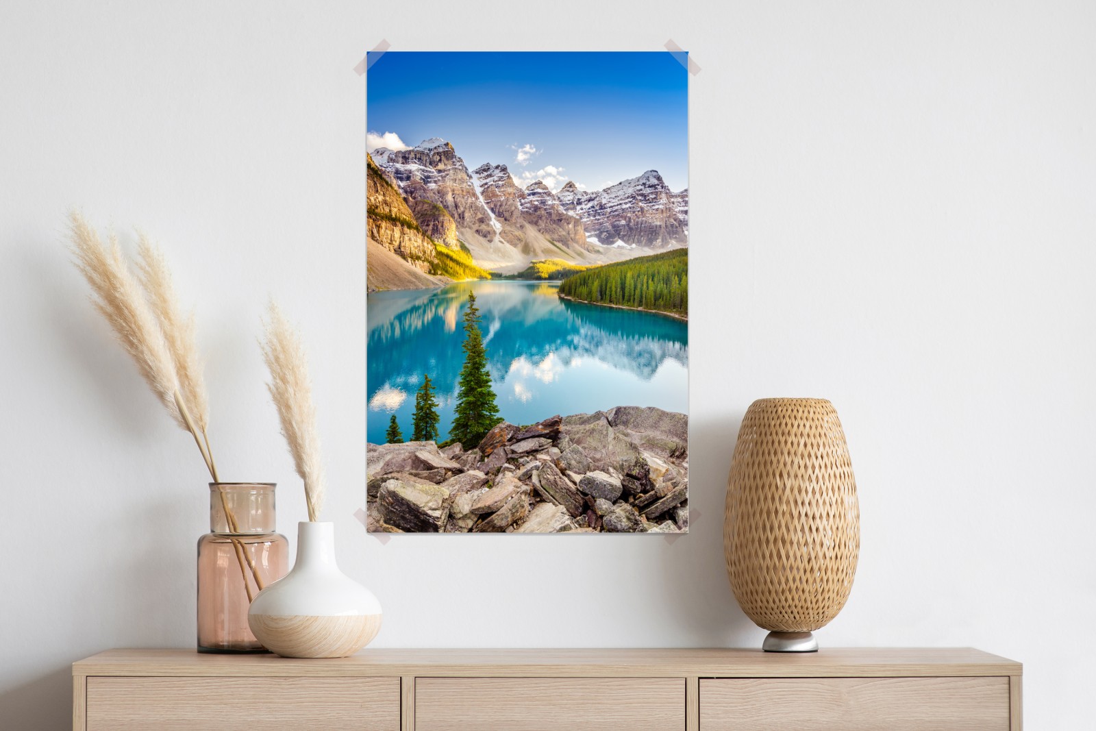 Wprowadź do wnętrza spokój jeziora Moraine dzięki intensywnym turkusowym wodom, surowym szczytom i odbiciom o zachodzie słońca.