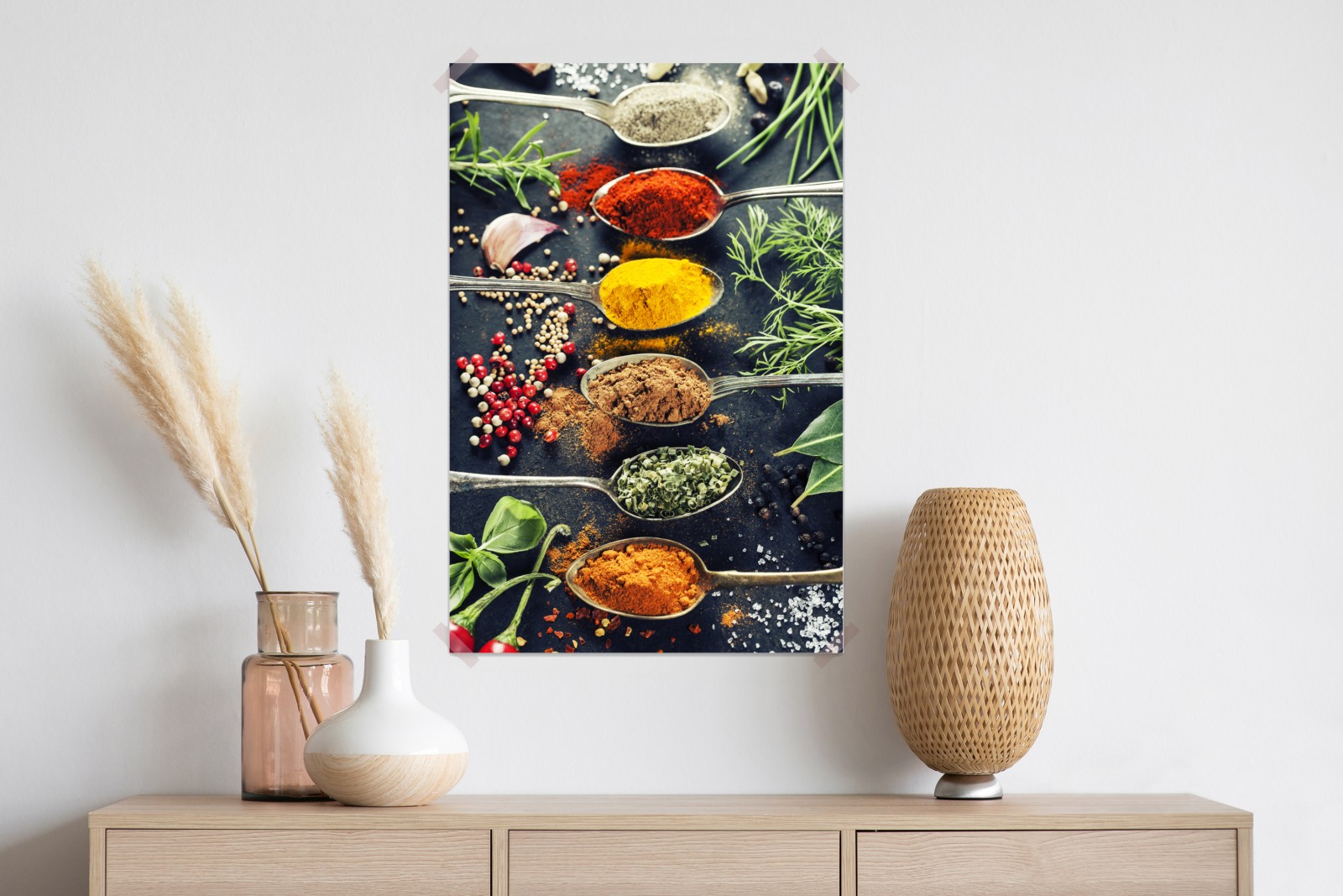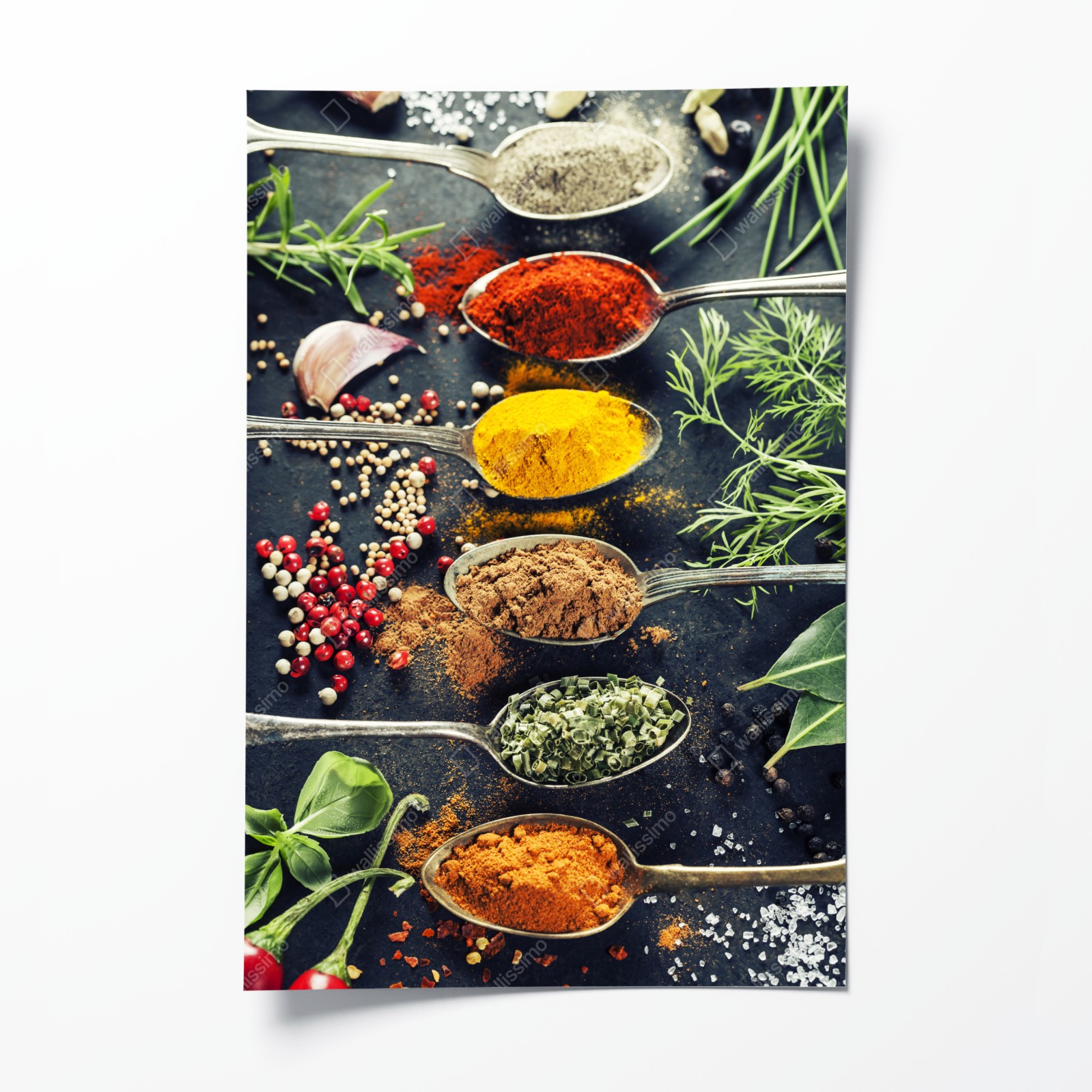 Dodaj charakteru kuchni dzięki kolorowemu zbliżeniu przypraw i świeżych ziół ułożonych na łyżkach.