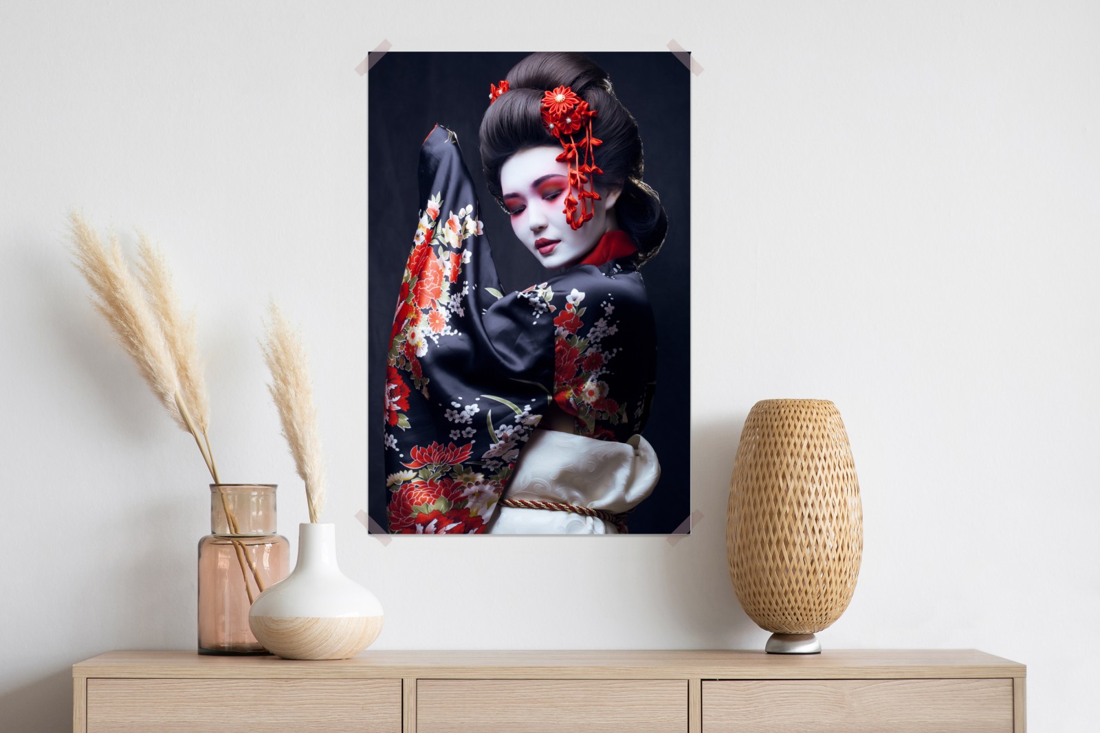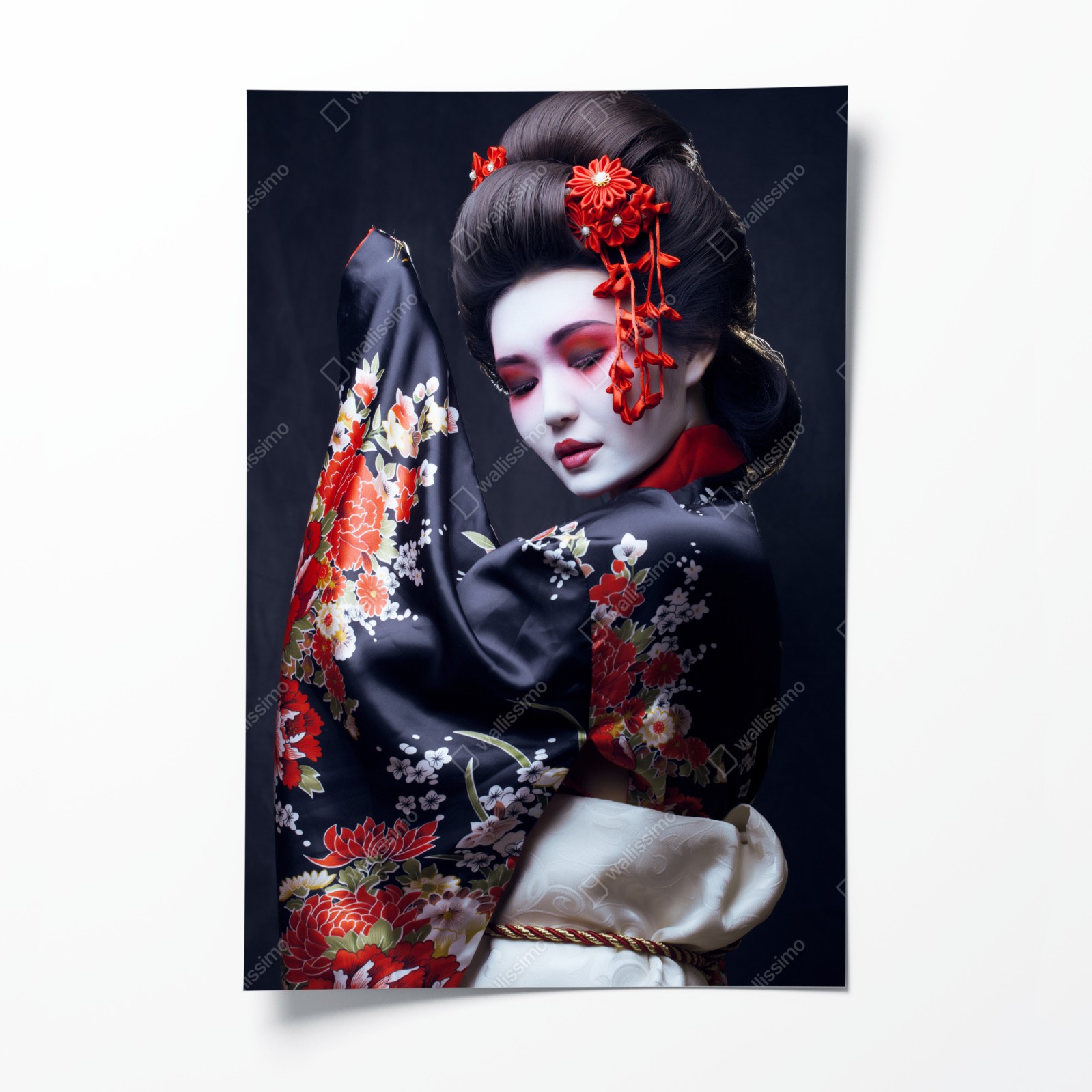 Plakat elegancki portret gejszy w czerwonym i czarnym kimonie – Wallissimo®