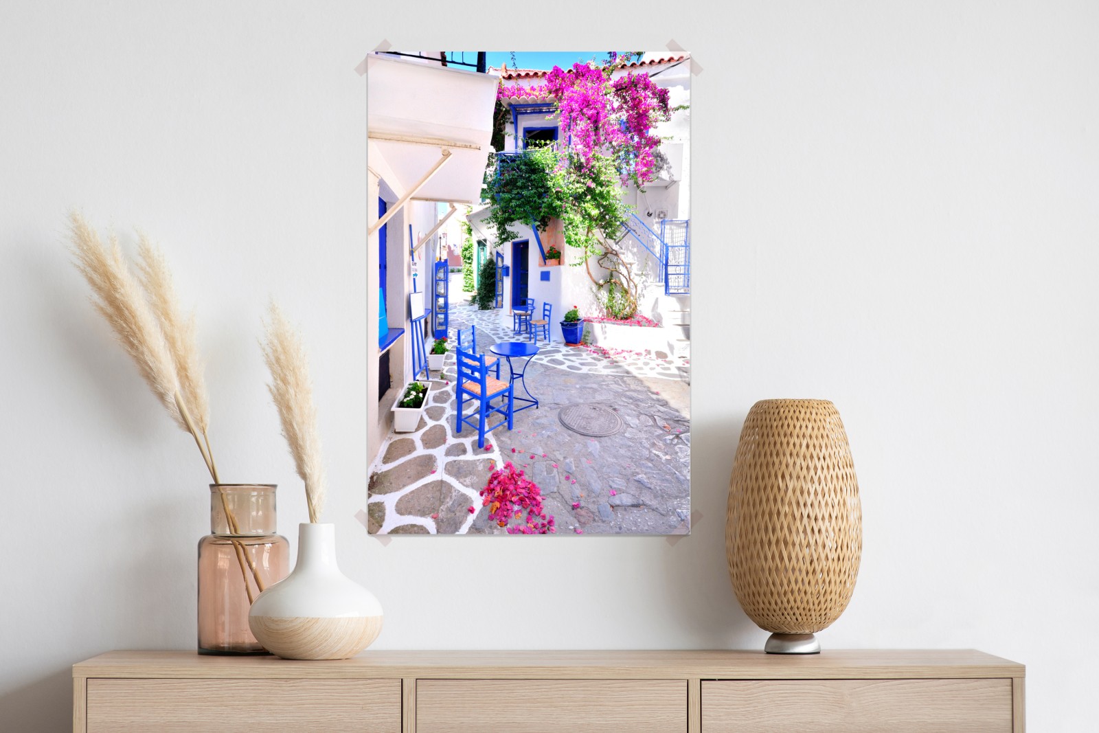 Plakat słoneczna uliczka z niebieskimi krzesłami – Wallissimo®